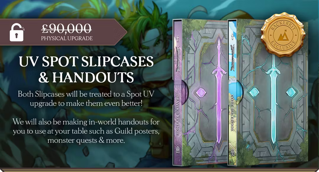 ✨ UV Spot Book Sleeves - Both slipcases will be upgraded to include some stunning Spot UV! 📜 Handouts - Immersive in-game handouts to bring your sessions to life, such as guild posters, monster quests and more!
