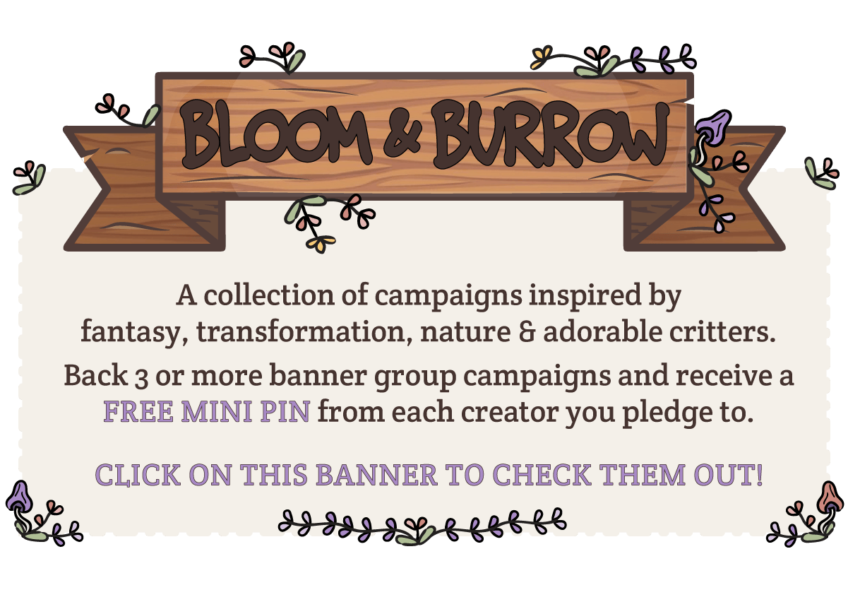 My project is part of theBloom & Burrow Banner, a collection of campaigns inspired by fantasy, nature & adorable critters! Pledge 3 or more Bloom & Burrow projects to receive a FREE pin from EACH projects you backed. Click the banner for more info!