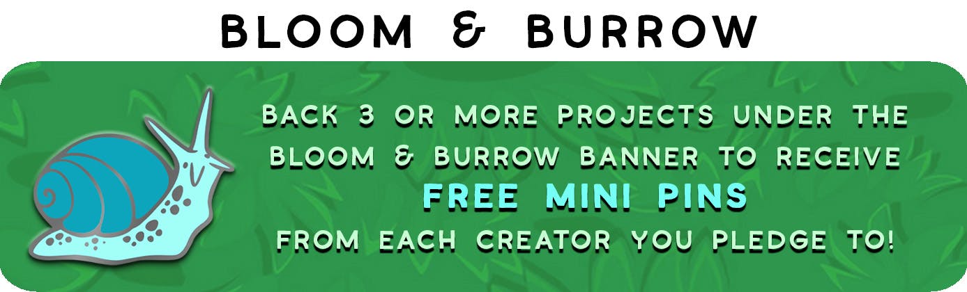 There’s also still a chance to earn a mini snail pin by supporting 3 or more projects under the Bloom & Burrow banner, plus a mini pin from each additional creator you support!