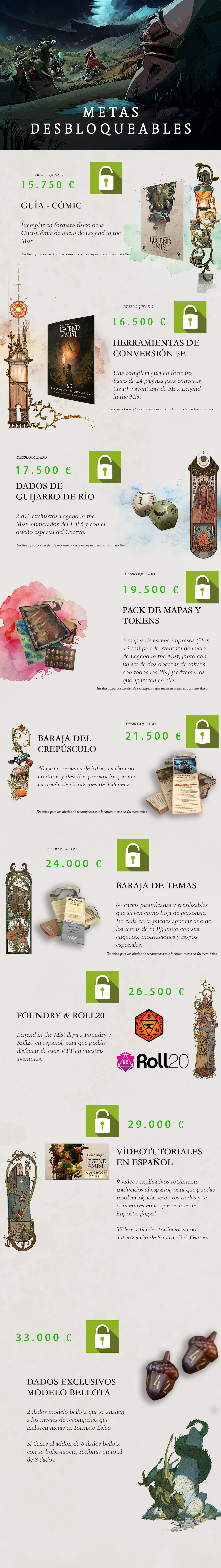 En este Backerkit queremos lanzar los dos manuales básicos (Vol. I - El héroe y Vol. II - El narrador), junto con el manual de ambientación Corazones de Valcuervo y una serie de complementos para el juego (pantalla del narrador, personajes pregenerados, barajas, dados, etc.).