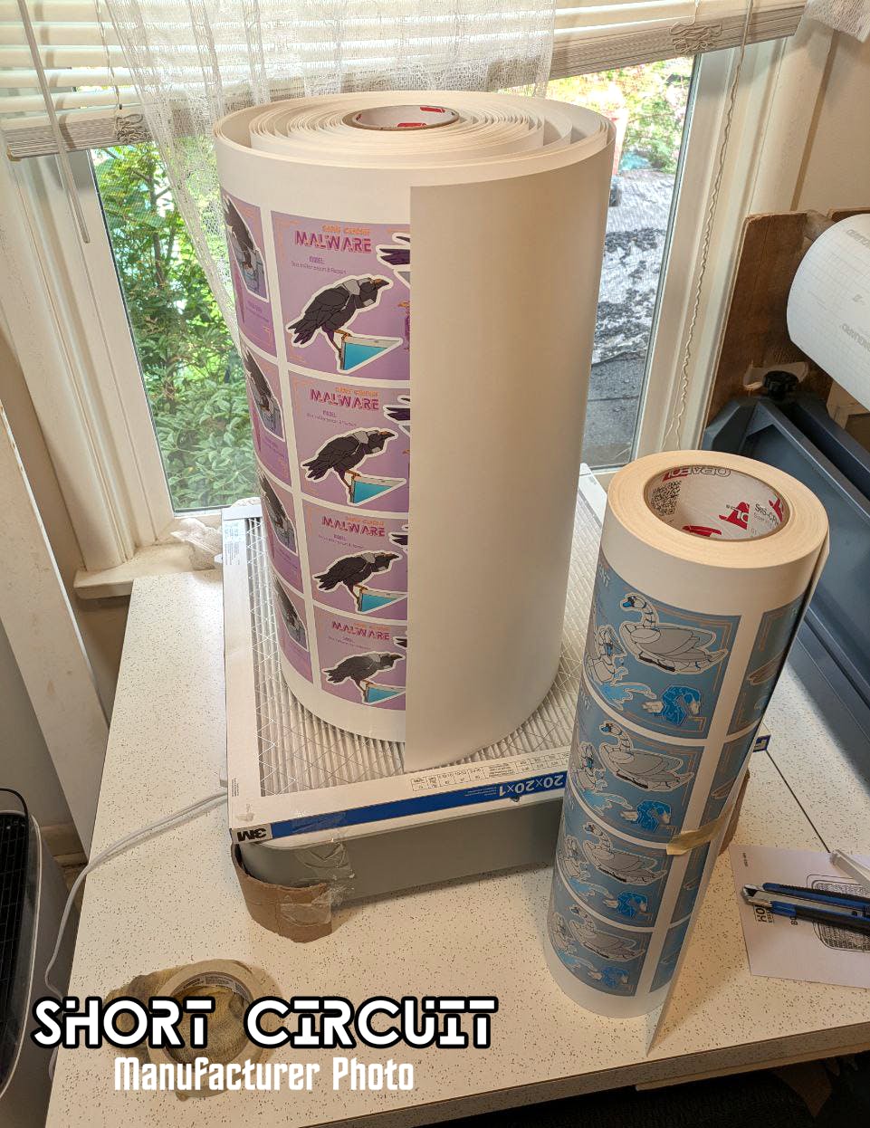 Let's start with some previews from my sticker supplier, who is himself an artist running a small business in Canada. Just the character art sticker sheets took up a stunning 136 feet of vinyl - here they are on the roll prior to lamination and cutting: