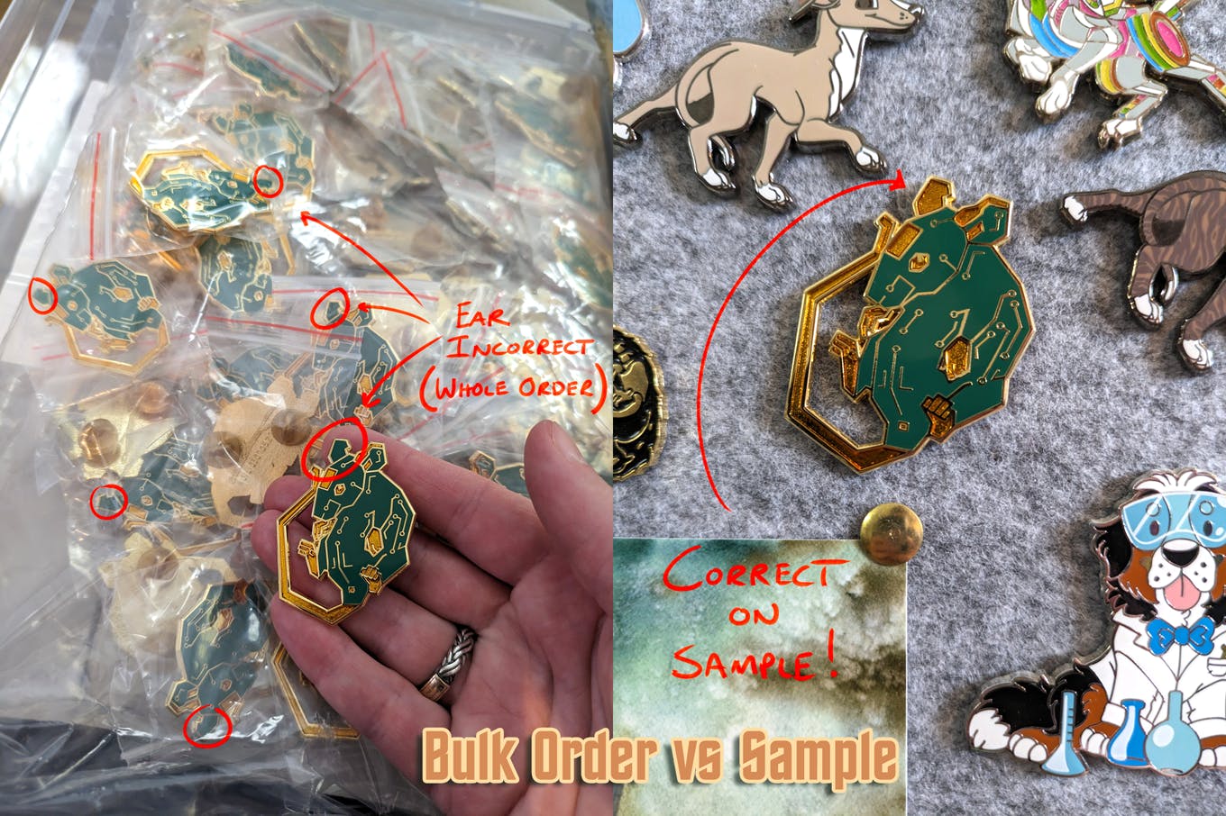 I double checked my Illustrator files, the proof my rep sent, and the samples I originally received (seen above on my personal pin board). The back ear is correct in all three places, so this was just straight up a mistake in manufacturing the bulk order.