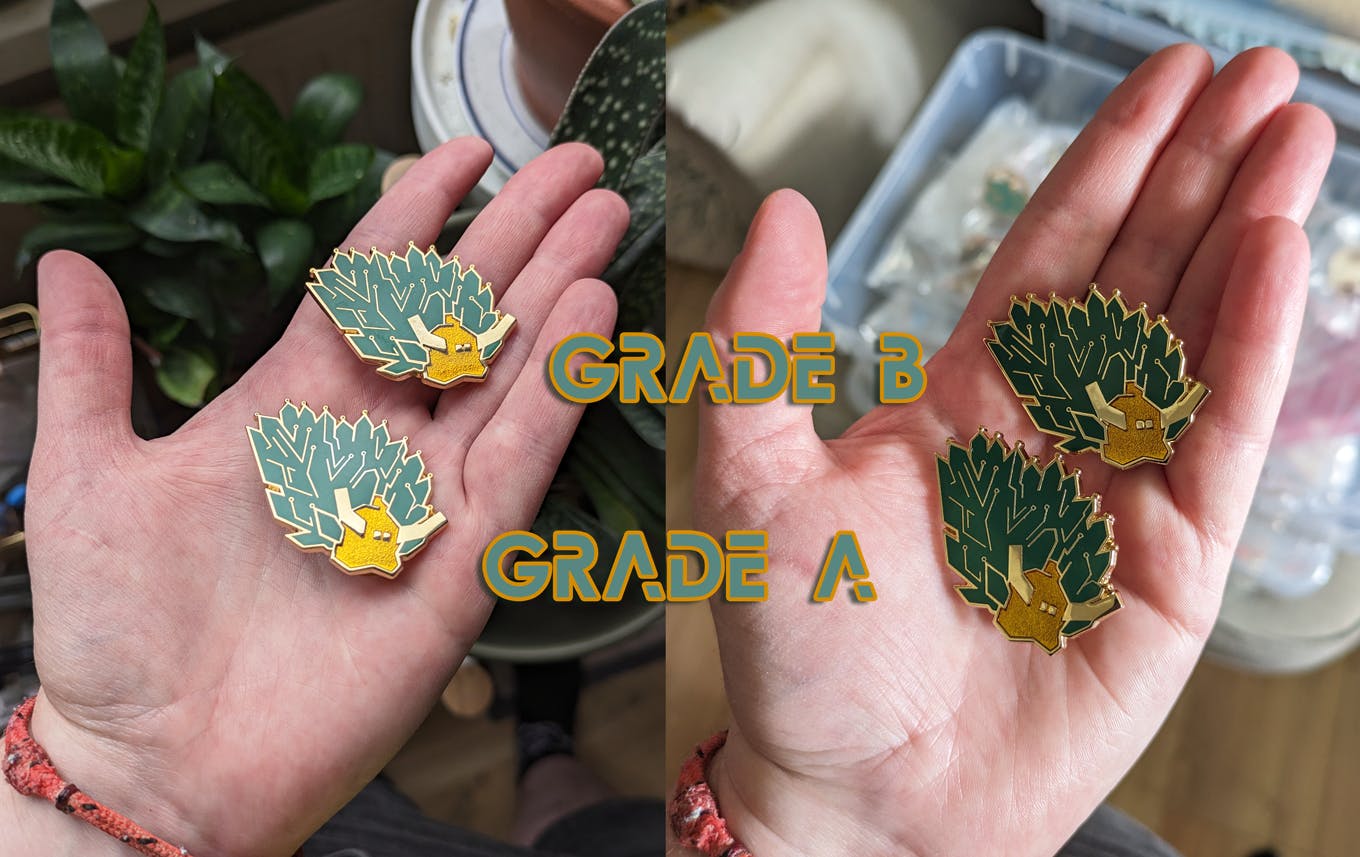 The difference between a standard "A Grade" and seconds "B Grade" can be fairly minor in a lot of cases. Enamel pins are handmade items and A Grades still may have small scratches or dings only visible from a certain angle, some little dinks in their metal lines, small bubbles and dust in the enamel, and so forth. B Grades have more visible or multiple of these deviations from the standard, and may also include things such as small areas of missing enamel or enamel overfill/underfill that change the overall aesthetic of the pin.