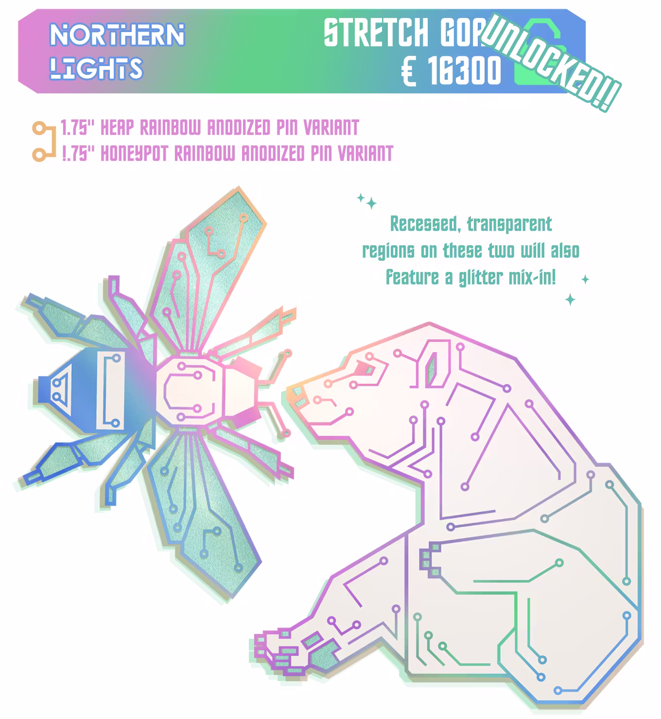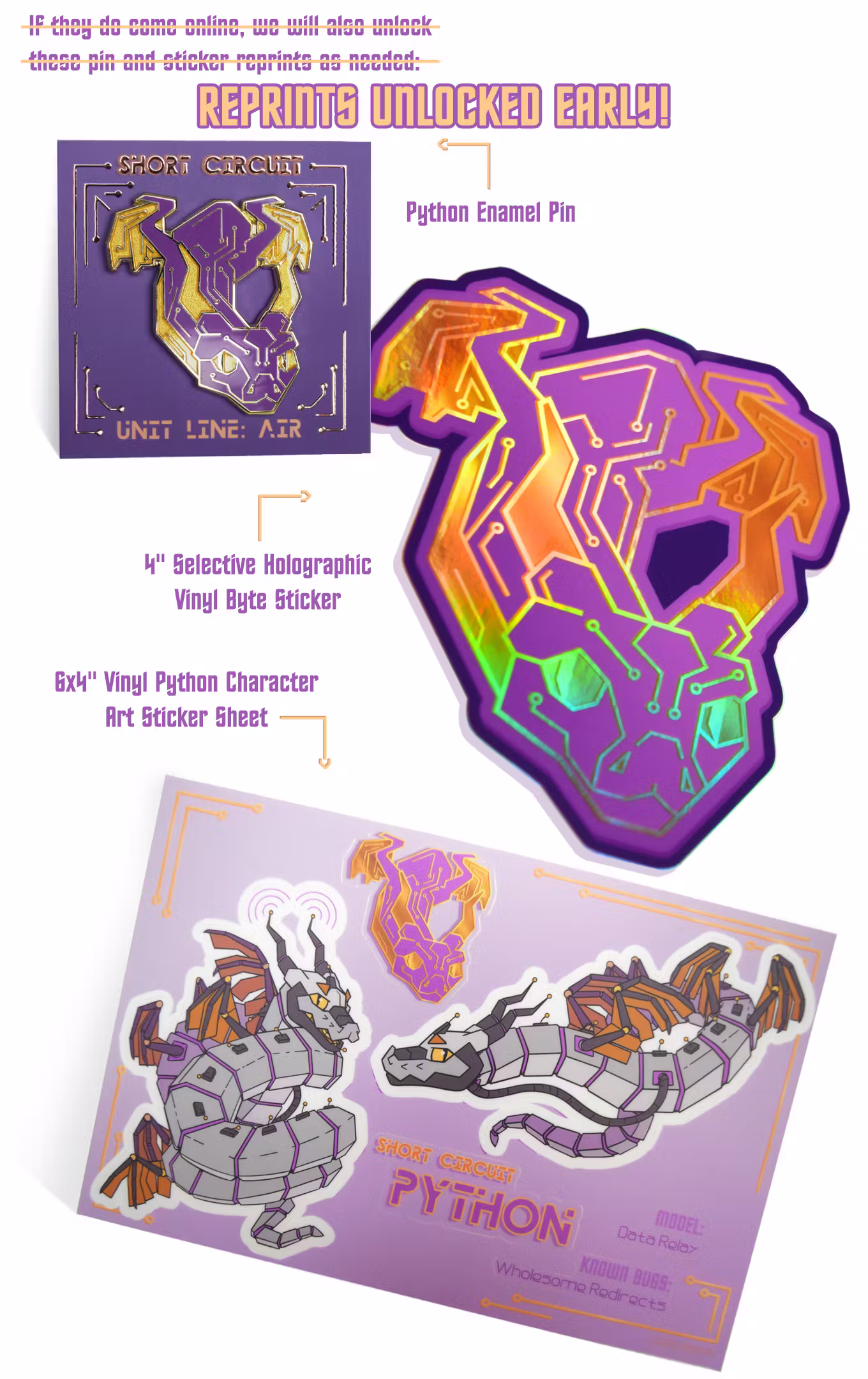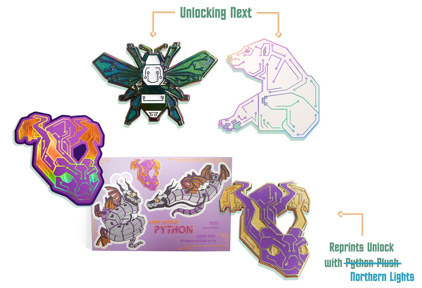 Python enjoyers who missed the last two Short Circuit installments, rejoice! If we reach the Northern Lights variants of Honeypot and Heap, we will also unlock reprints of the Python pin and stickers, meaning all the stickers and pins highlighted in the summary post will be selectable options at the campaign's conclusion.