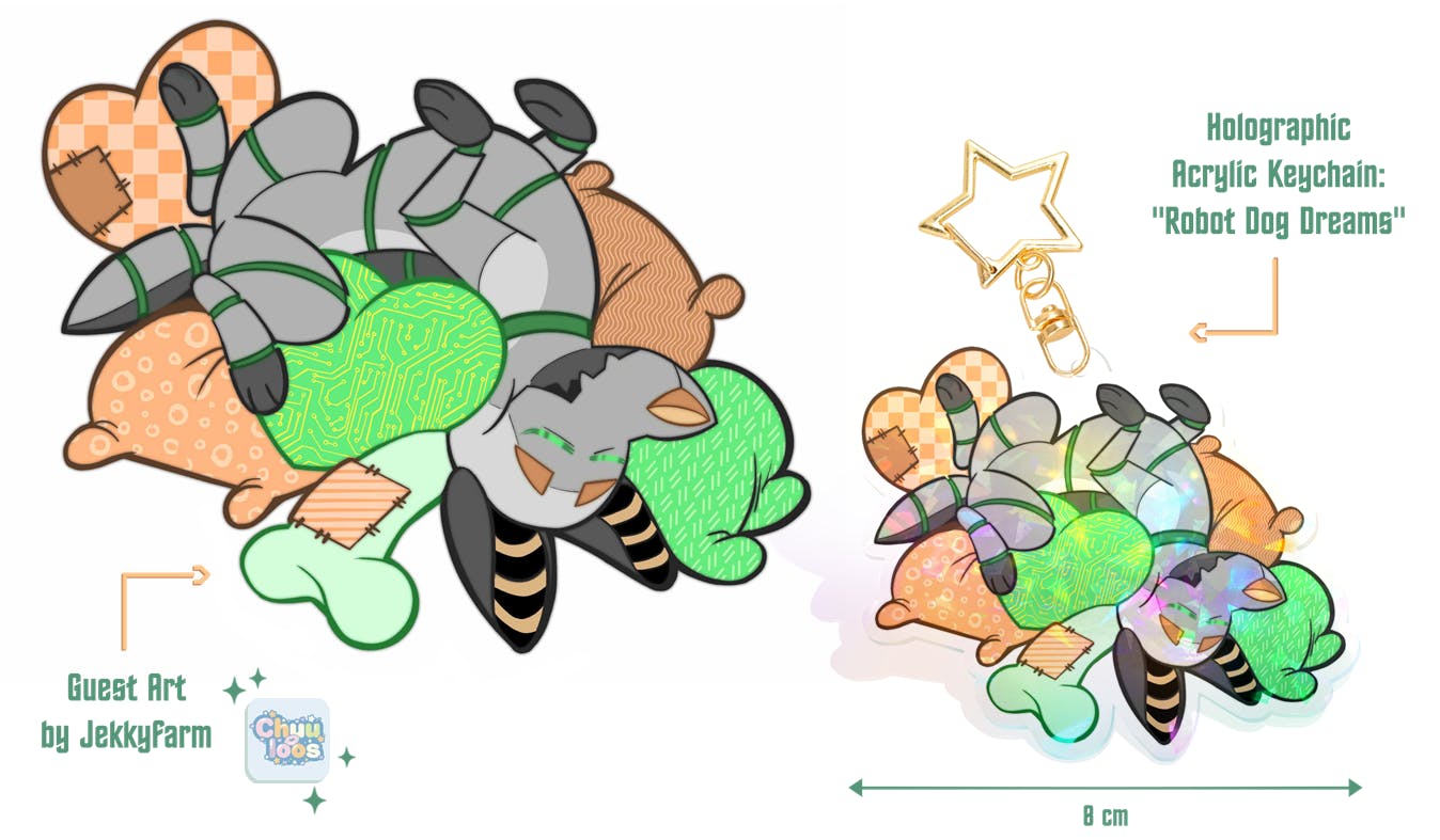 And so our second keychain, Robot Dog Dreams, features the most relaxed robot you ever did see. This adorable rendition is by the amazing Jekkyfarm (Jekky), the creator of Chuuloos!