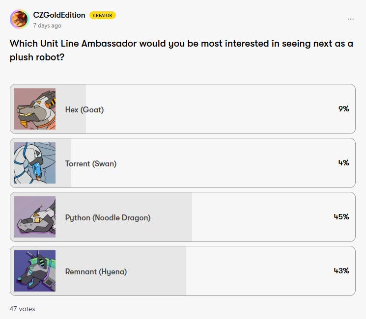 Currently running: if we fund the Byte plush and initial barrage of planned pins, then which ambassador robot would you be most interested in seeing come to life next?? Python and Remnant keep tying on and off, so it could be anybody's race!