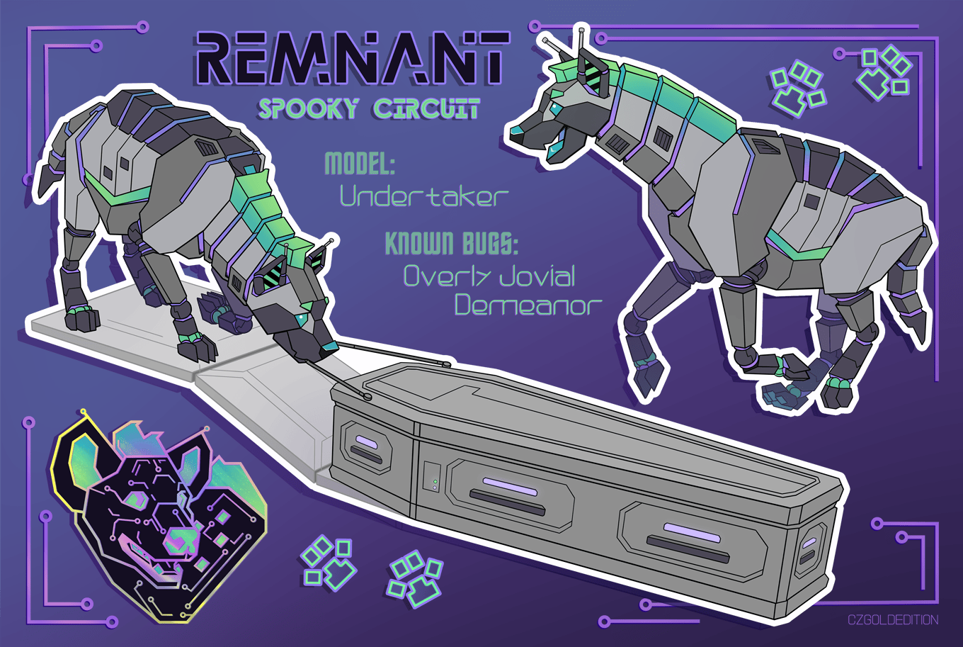 I've given this unit paneling reminiscent of tuxedo cat markings. <3 From the wiring, it looks like both Defrag & Decomm were busy decommissioning the same Fire line bot~