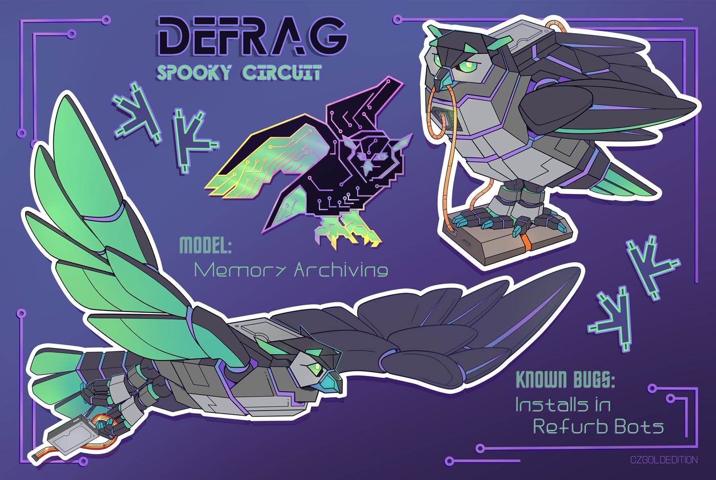 The robot character art for Defrag is complete, and I hope you love them as much as I do! Everything here will be a useable kiss-cut sticker, including the text and the little geometric owl tracks. <3