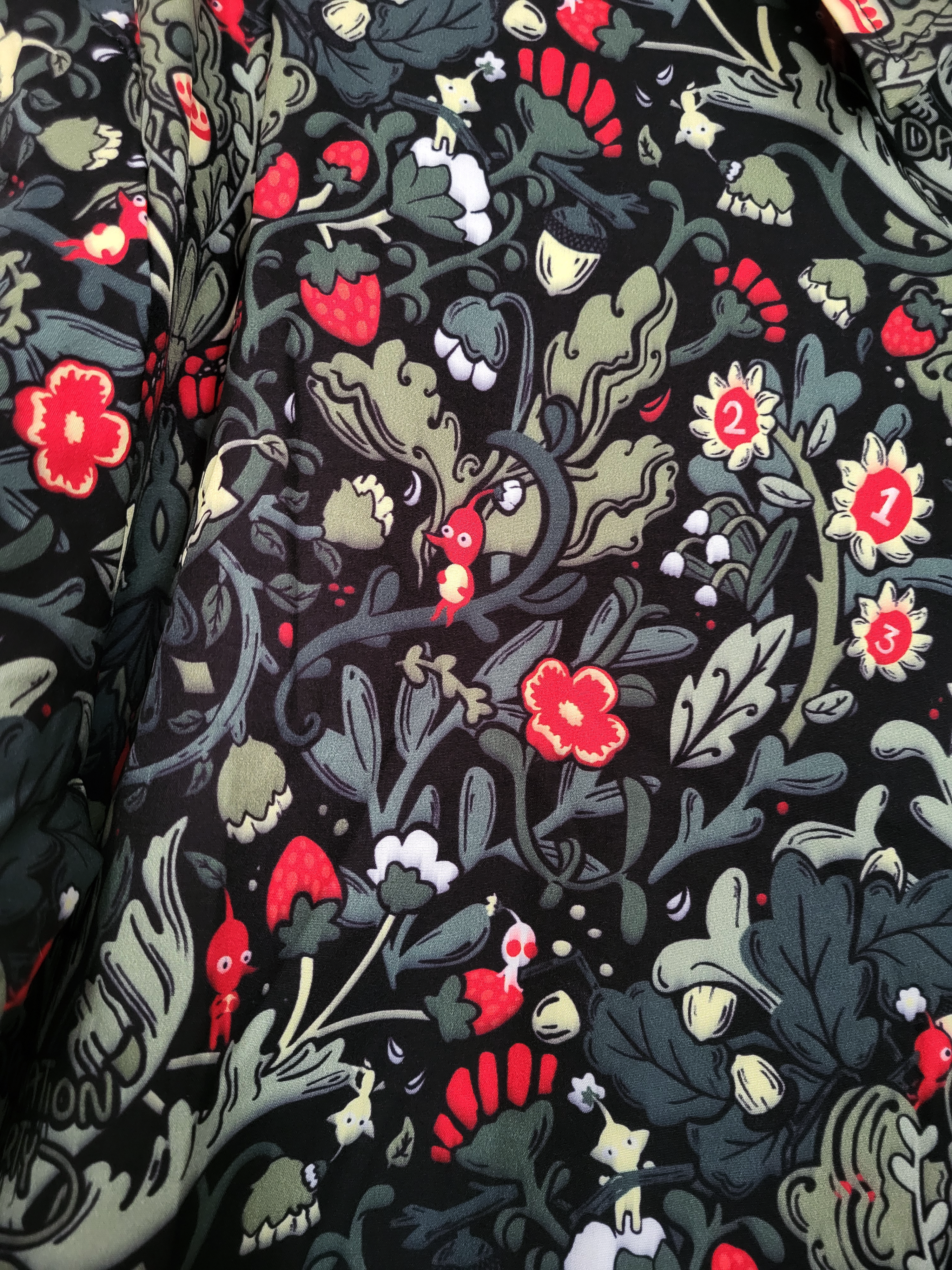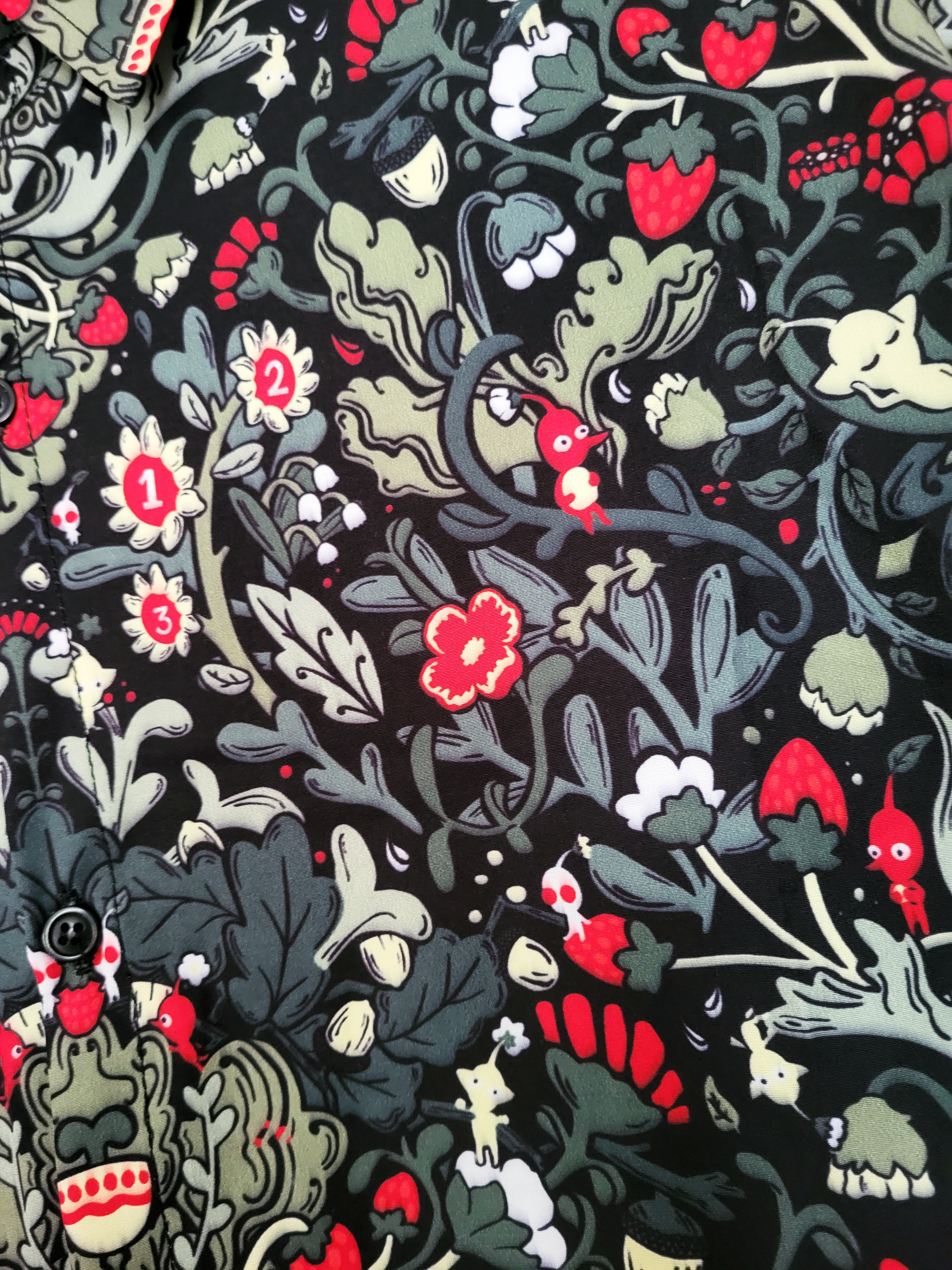 Button up shirts of Pikmin in the nature-filled style of William Morris.
