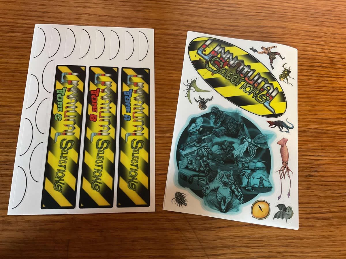 If you didn’t notice them on the add-ons, there is a 2-sticker sheet set that may be the perfect thing for those of you that are “monsters only” backers. These stickers give you waterproof, permanent-stick images and labels you could put on the outside of your own binders to decorate them in an “Unnatural Selections” fashion. I, myself, have all the monsters in a single, bigger binder I ordered online, and I have used a few of the stickers on it to show them off. There are also “tab cover” stickers for those that have the “deluxe” version of the product and need to write-over different partitions you made previously on those divider pages.