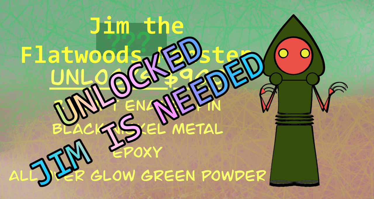 Obcollectors has decided to unlock her regular Flatwoods Monster pin, Jim, whether or not she reaches the goal for him. So that leaves six unlocks to choose from with her!