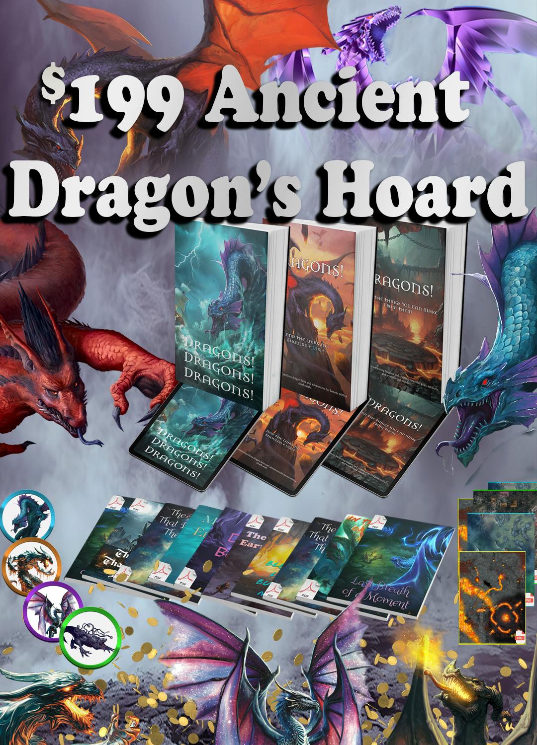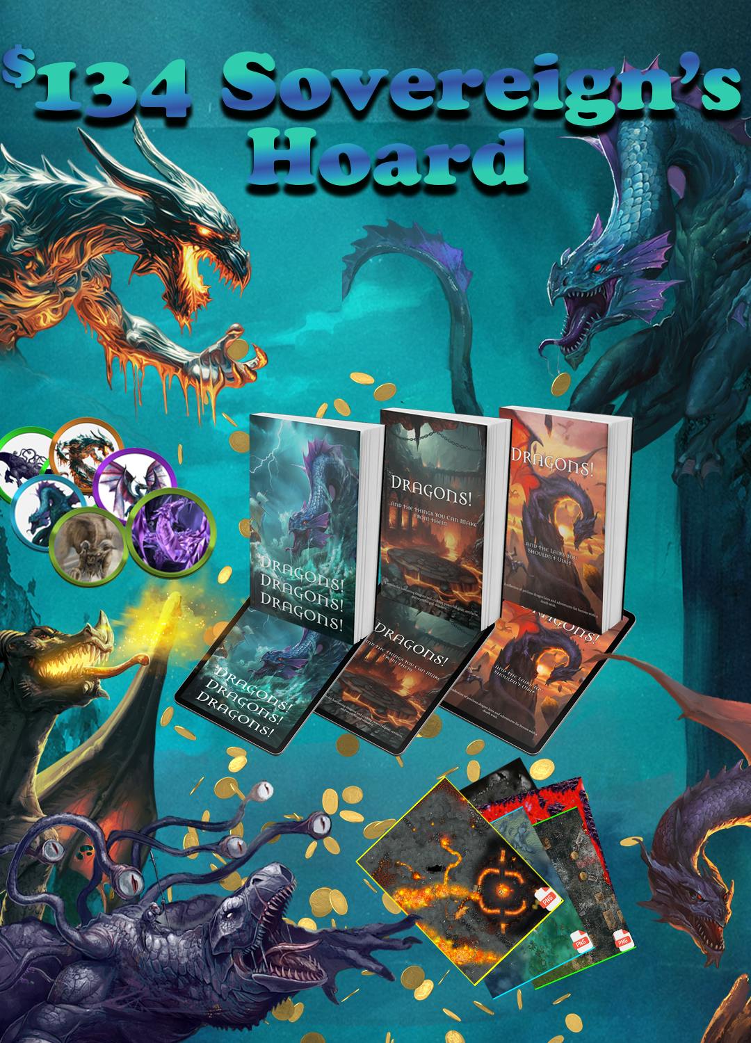 $199 Ancient Dragon's Hoard - The ultimate dragon experience! This tier gives you everything from the Sovereign Hoard: full Foundry VTT support for every dragon and lair, high-resolution digital maps, and VTT tokens, plus 10 fully ready-to-run dragon adventures (tier 1–4), story hooks, and tactical guidance. Shipping fees collected post-campaign in Pledge Manager.