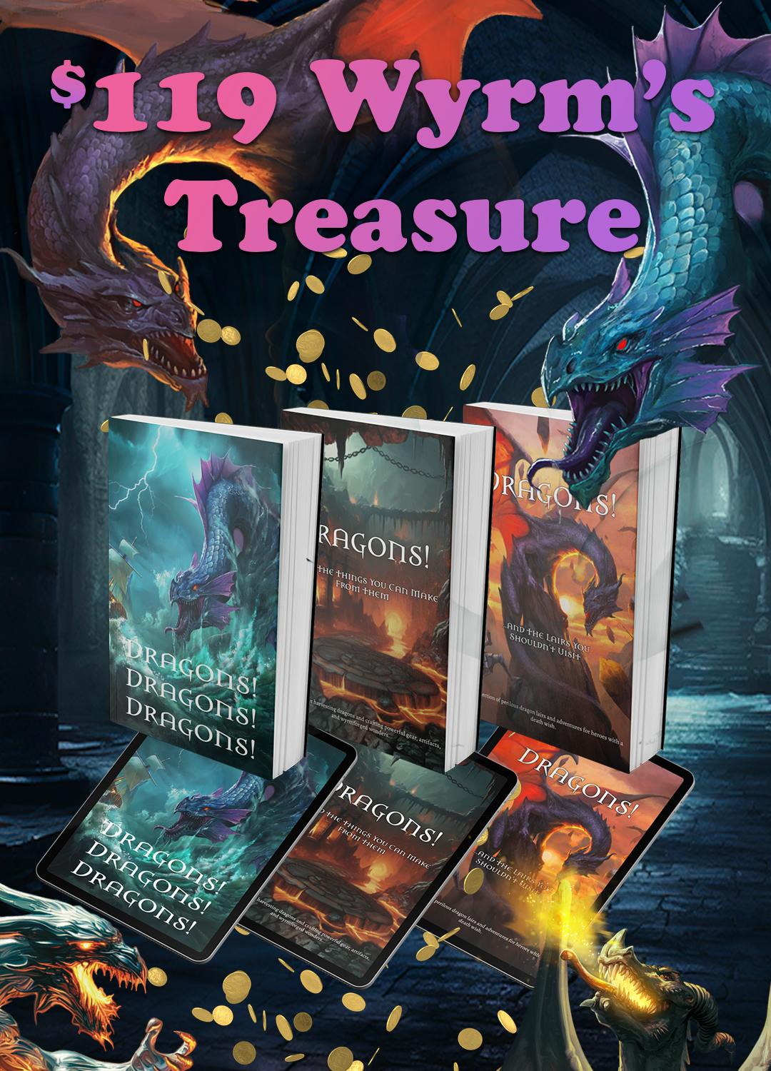 $119 Wyrm's Treasure - Get all three books in physical and PDF format: the Dragons Bestiary, Lairs Book, and Item & Crafting Guide. Shipping fees collected post-campaign in Pledge Manager.