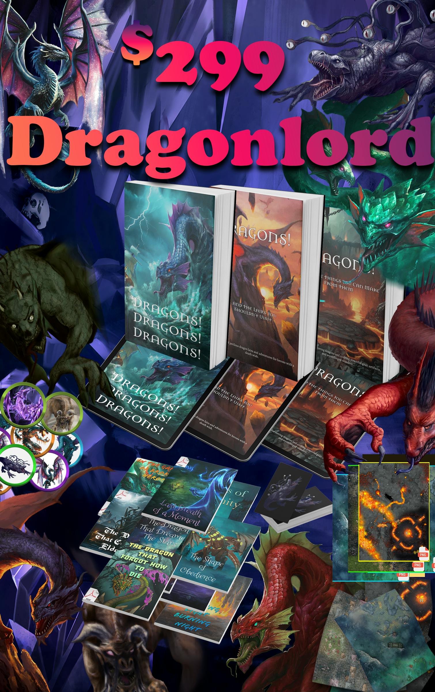 $299 Dragonlord - Take your dragon encounters to the next level. This tier includes everything from the Ancient Hoard: Foundry modules, high-resolution digital maps, 10 ready-to-run dragon adventures, plus physical dragon stat cards and high-quality printed maps for all lairs, anencounter scaling guide, a mutation guide to add even more variety to your dragons, and mythic dragon templates to make your dragons even more fearsome! Shipping fees collected post-campaign in Pledge Manager.