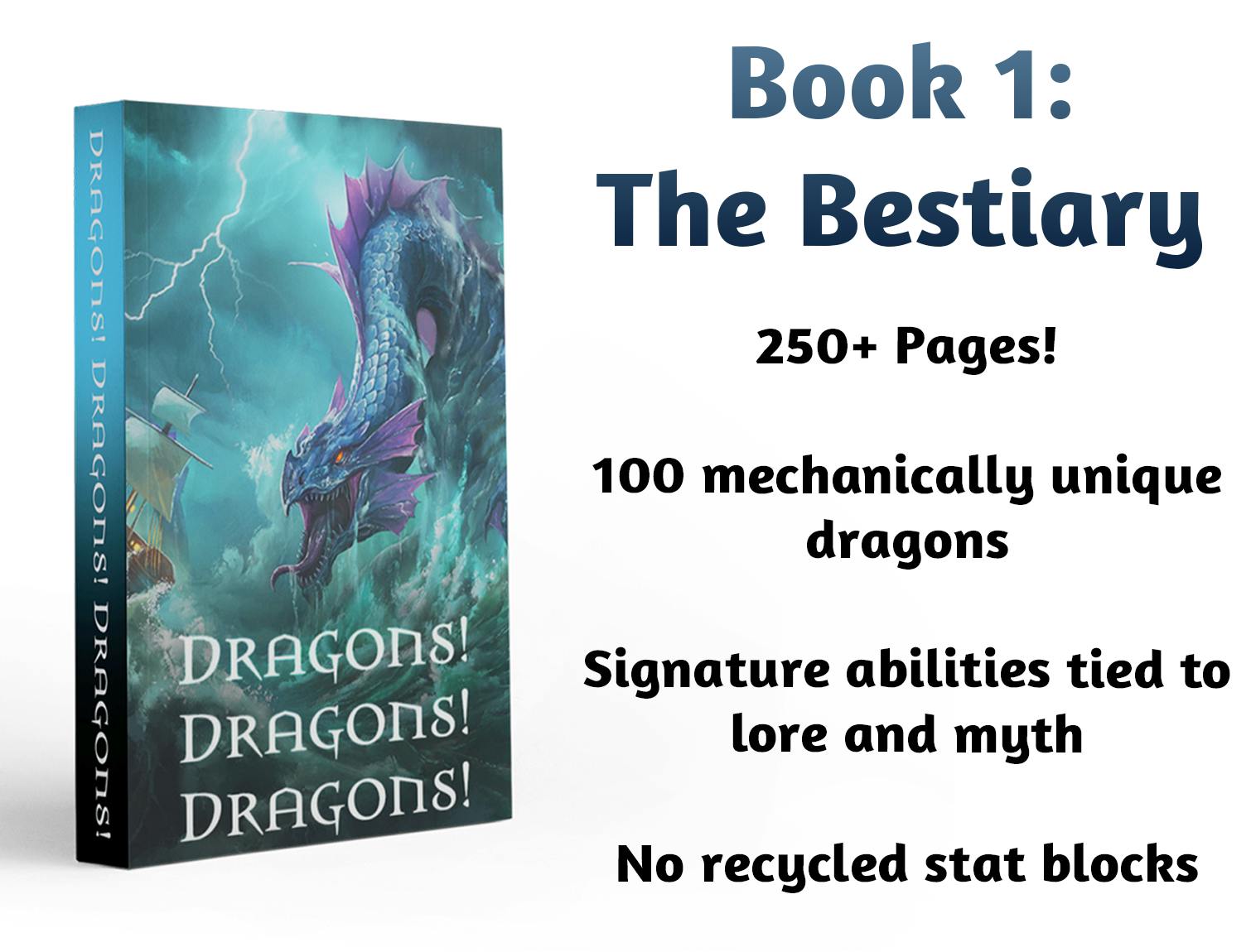 PDF of the 250-page bestiary, Dragons! Dragons! Dragons! which includes over 100 unique dragons, stats, and lore. Plus original, human-made art for each dragon.