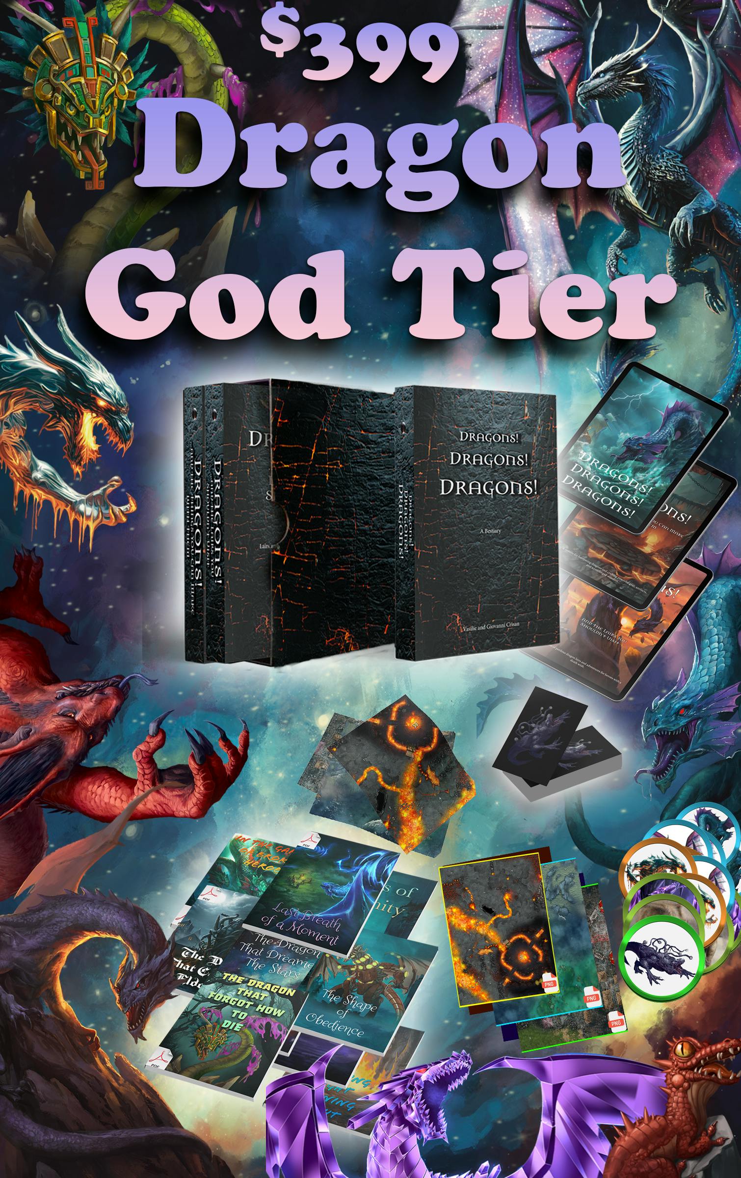 $399 Dragon-god Tier - This tier includes everything from Dragonlord: Foundry modules, high-resolution digital maps, 10 ready-to-run dragon adventures, physical dragon stat cards and high-quality printed maps for all lairs, an encounter scaling guide, a mutation guide to add even more variety to your dragons, and mythic dragon templates, plus a limited edition slipcase and dragon scale-effect covers for all three books. Shipping fees collected post-campaign in Pledge Manager.