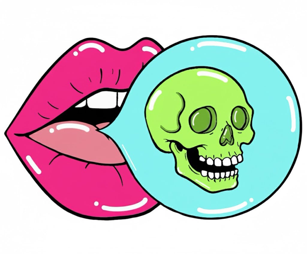Life is short, make it sweet. 💖 A bold, neon-infused bubblegum pop art design with a dark twist. Full pink glitter lips and vibrant UV and glow.
