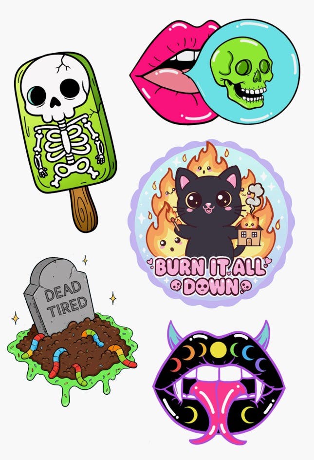 All stickers range from 2.5” and the widest part, up to the largest (Mr. Skelly-Pop) at 3.5” tall. All sticker prices will remain at $4 each.