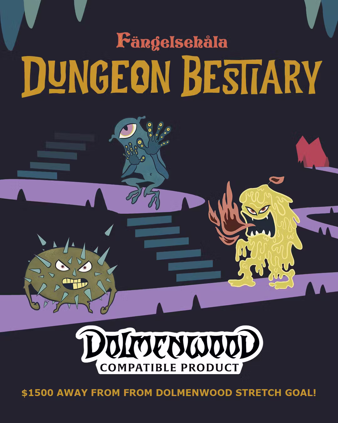 Next is unlocking our first stretch goal! A digital layout of the Action - Item - Mystery (AIM) procedure that will spark adventure ideas for your Fängelsehåla games! We just need to hit $2500 CDN - so please share the link to the Dungeon Bestiary on socials, as it does help the algorithm to make us more discoverable!