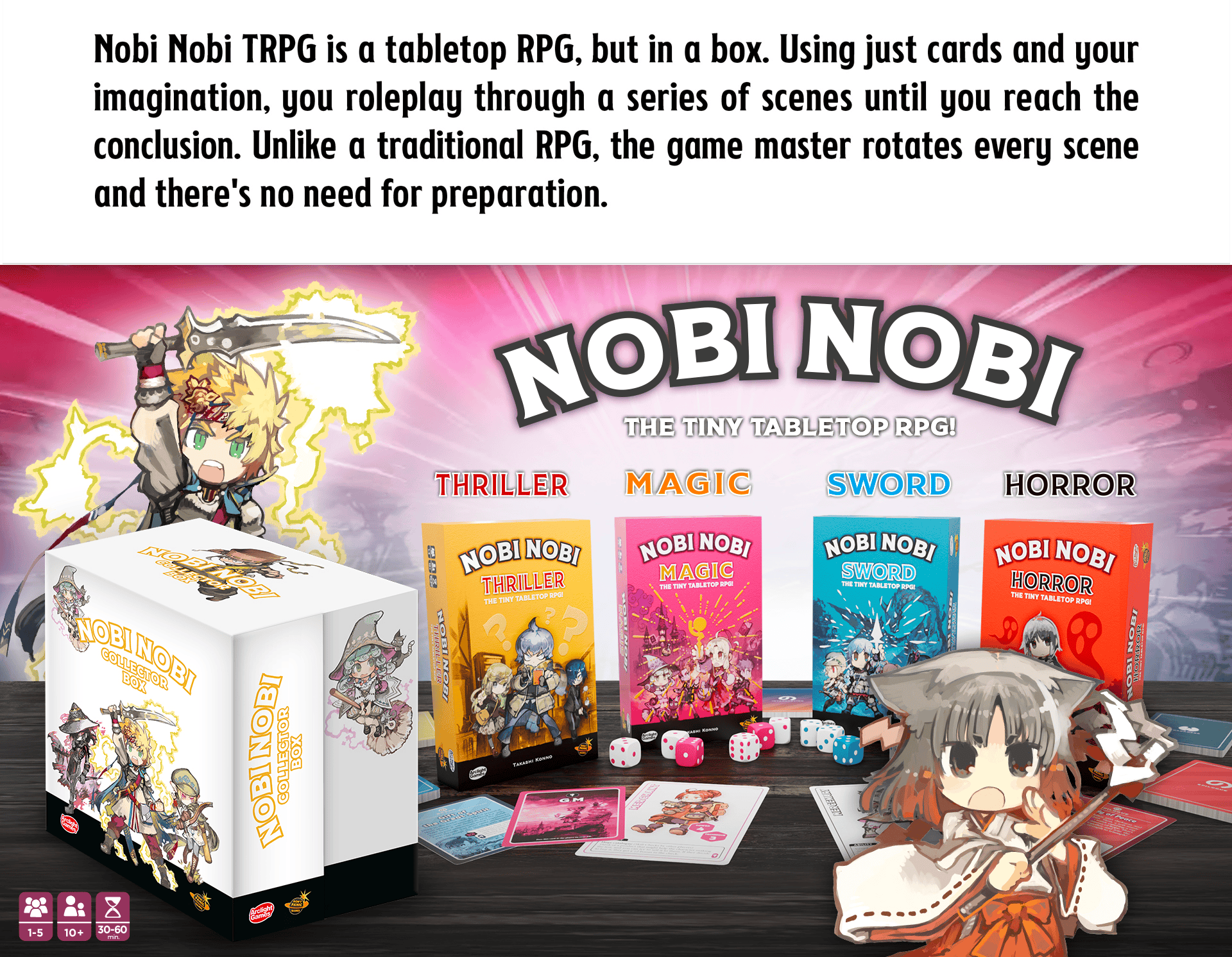 Each Nobi Nobi TTRPG box is self-contained and makes up a complete game, but you can also combine cards from all the boxes to create even wilder stories!