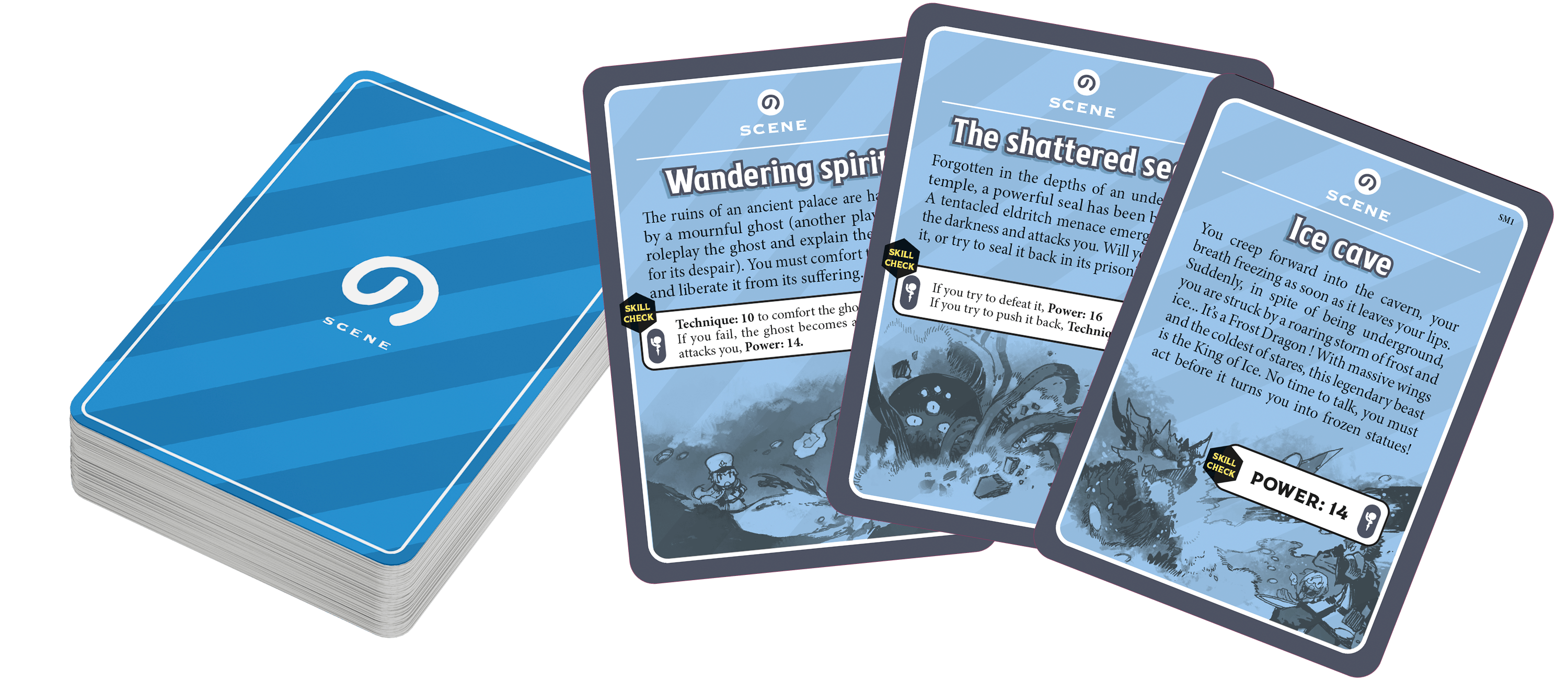 Then, game flow is very simple: the GM draws a Scene card, reads it, and connects it to the previous scene (e.g., explaining how the party moved from the dark dungeon to the bustling city market).