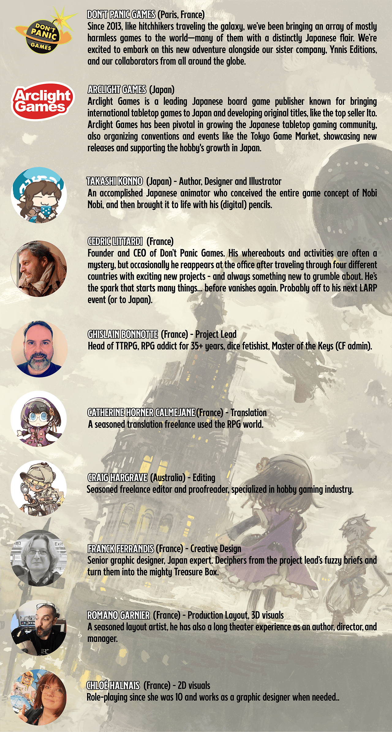 After a successful first crowdfunding campaign to launch the Nobi Nobi TTPRG line, we're returning with two more adventure settings: Cyberpunk, and Steampunk.
