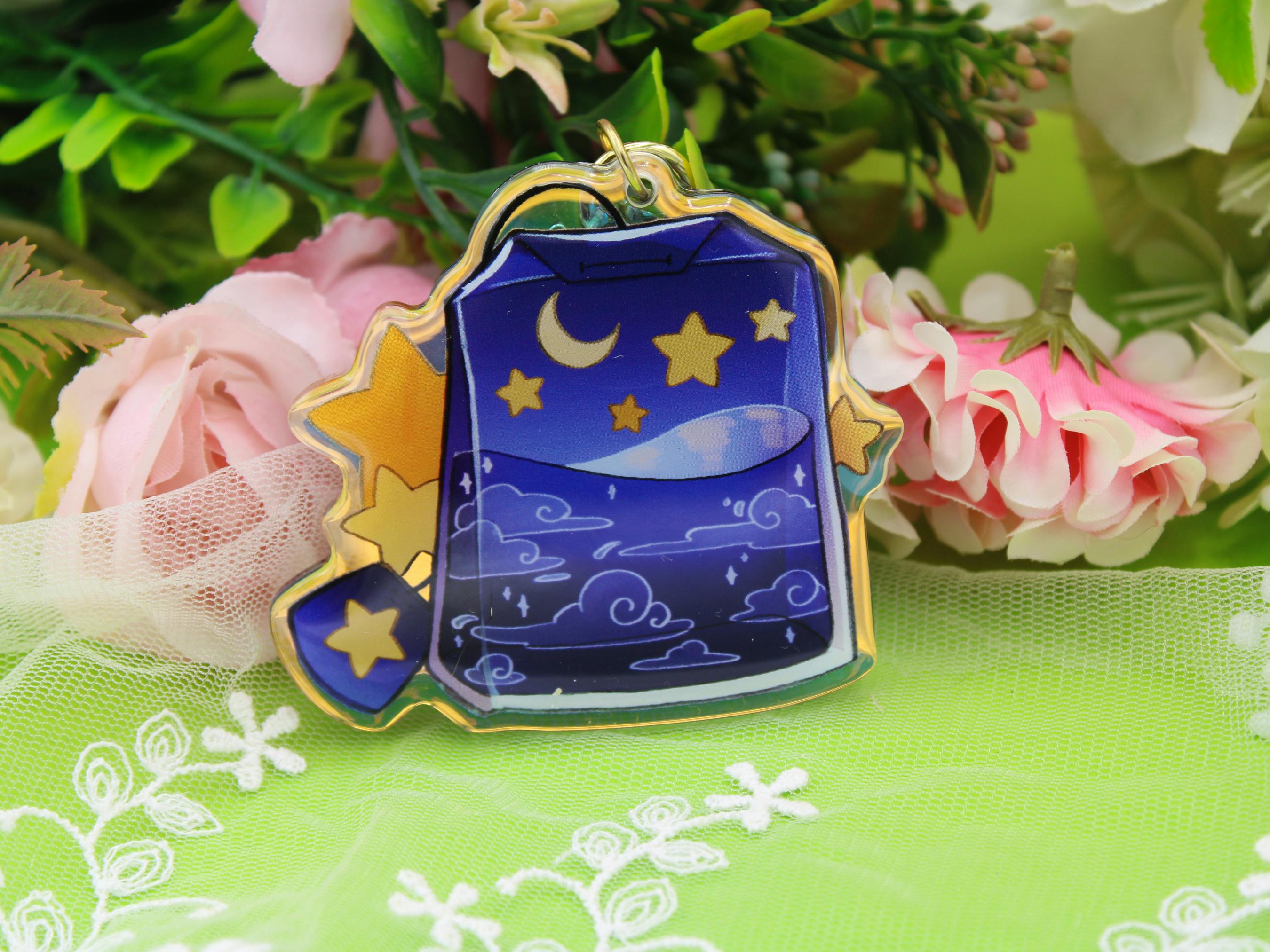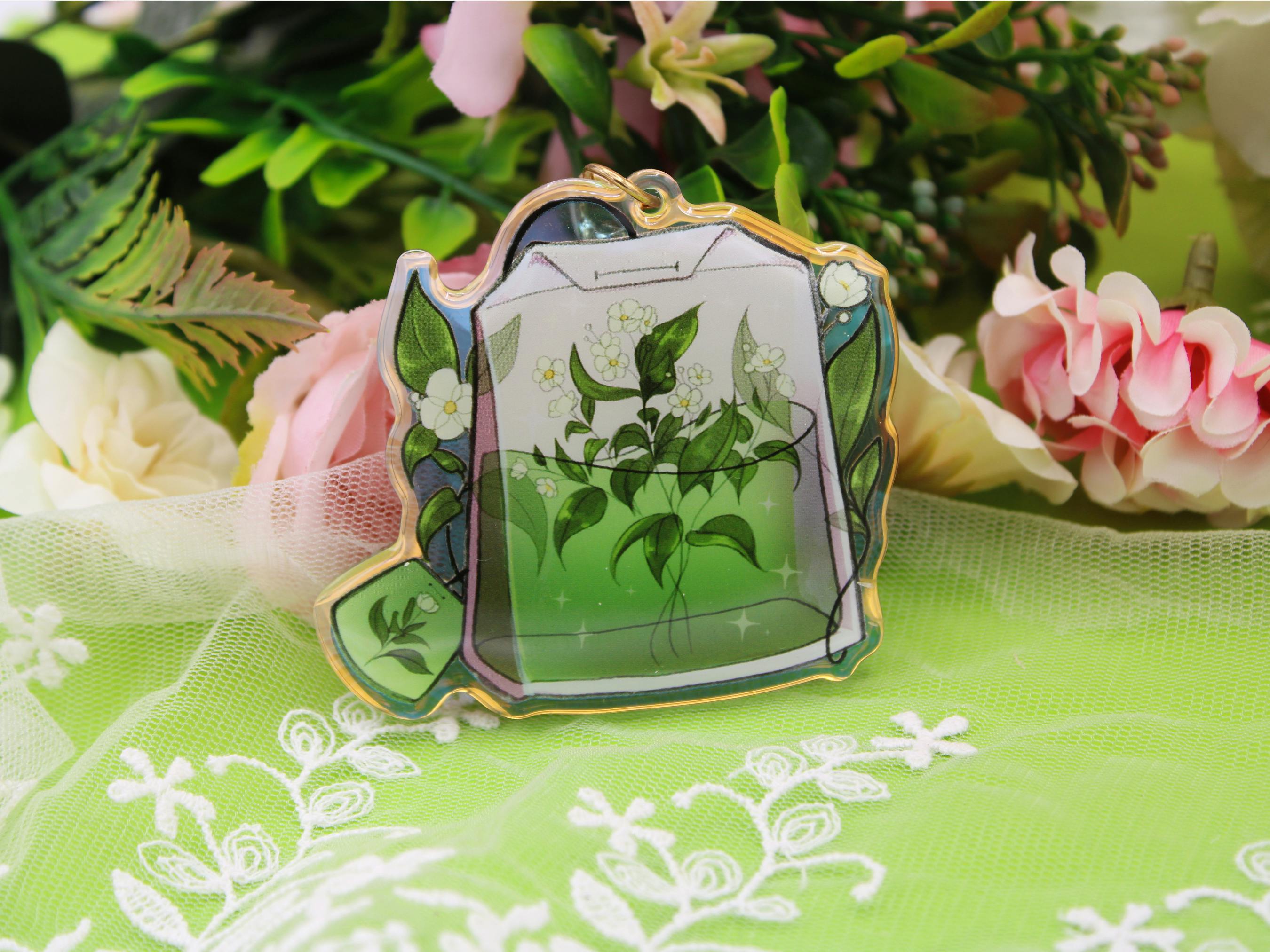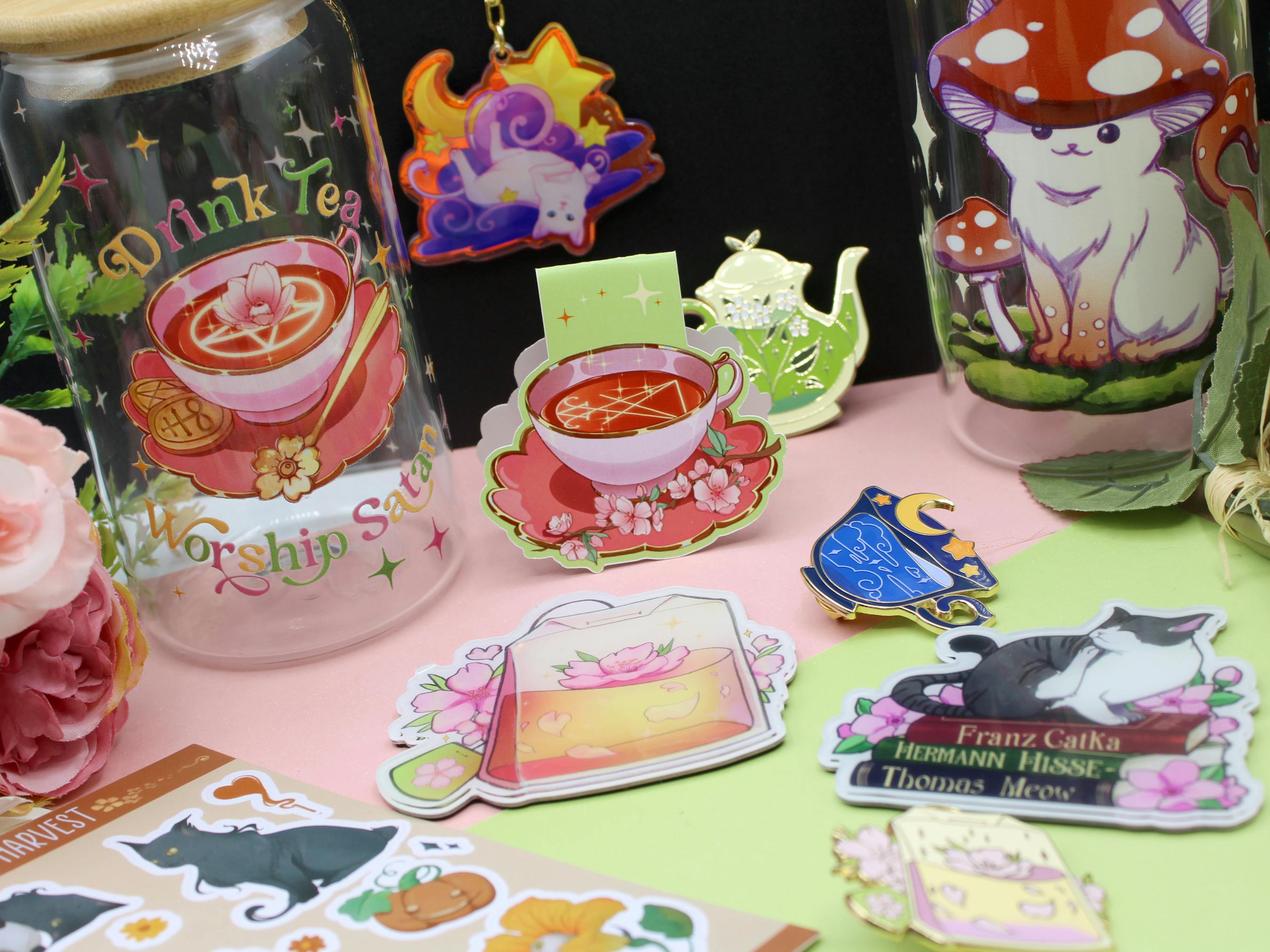 My biggest pin collection so far! Consisting of 3 subsets with a theme each: green tea themed, celestial themed, cherry blossom themed. Each one has a tea cup, a tea pot and a tea bag, plus a mini pin set. The celestial one has two more designs: a cosmic sugar jar and a blue etagere full of snacks. Available as pins and stickers, the tea bags are also acrylic charms.
