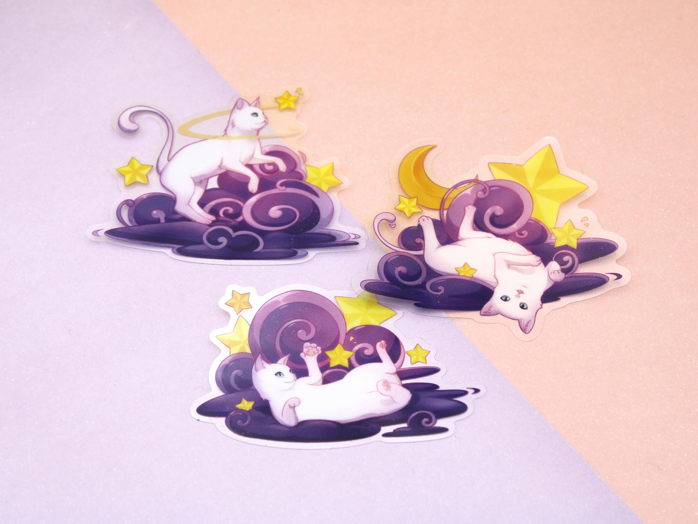 My newer take on cats - white cats didn't get a book pin, so this trio of designs is dedicated to them instead: three white cats on stylized clouds with stars and moon. Super whimsical! Available as charms and transparent PET stickers.