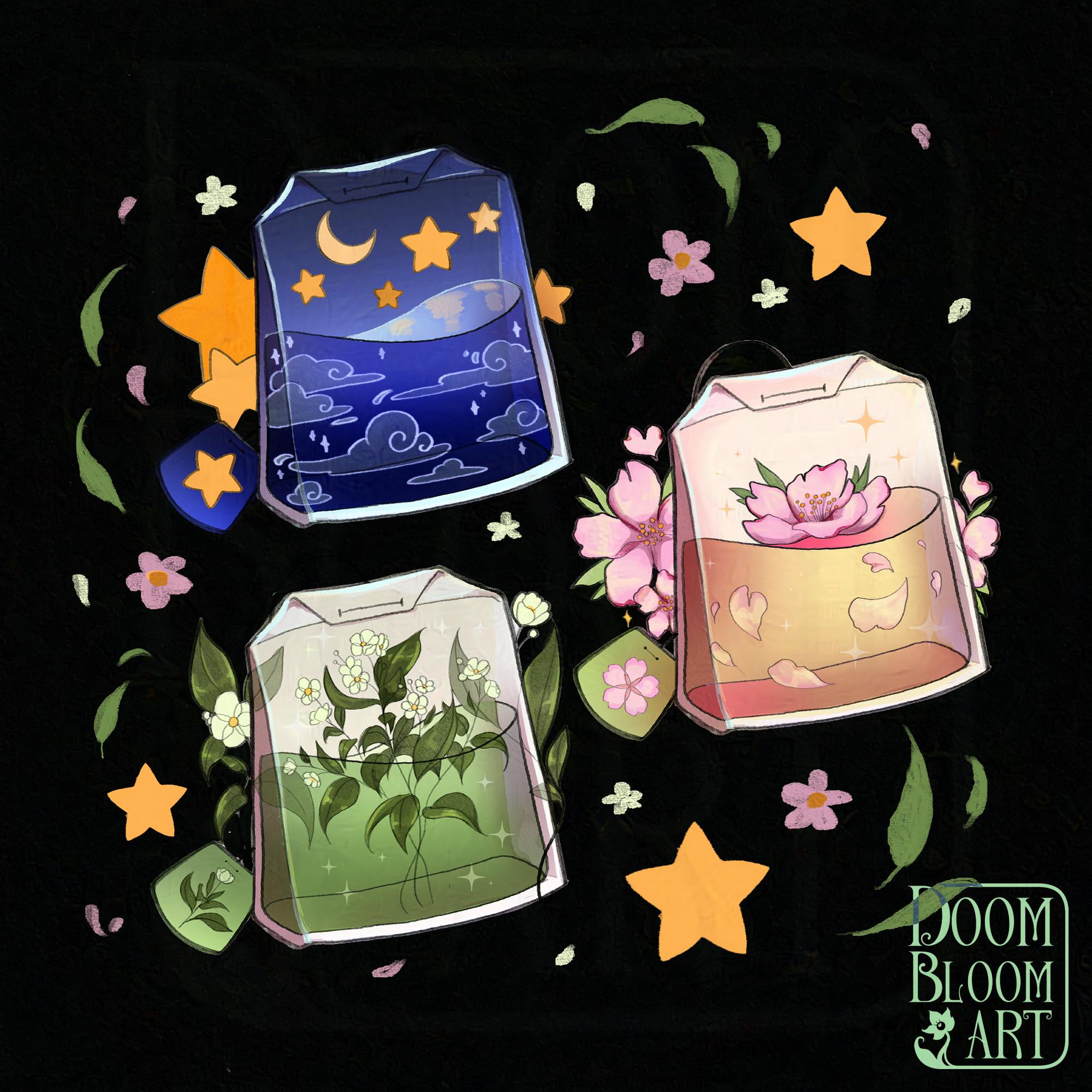 Lastly - let me introduce mysel! My name is Averil (or Ming, in real life) and I run DoomBloomArt, a little art shop. I love cozy themes in strong vibrant colors, as well as a little bit of bite! Pairing pretty, innocent colors with complete unhingedness, a little weirdness or just some ick is my favourite thing to do! And of course I'm a tea drinker.