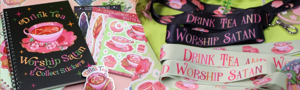 - Sticker Book with blank silicone paper: Drink Tea, Worship Satan & Collect Stickers (value 18€ -> 12.6€) - 1x Drink Tea Worship Satan Holo Sticker (value 3€ -> 2.1€) - 9x Magic Tea Party Stickers (value 23€ -> 16.1€) - 1x Occult Tea Party Sticker (value 6€ -> 4.2€) Value 50€ -> 35€ (30% off)