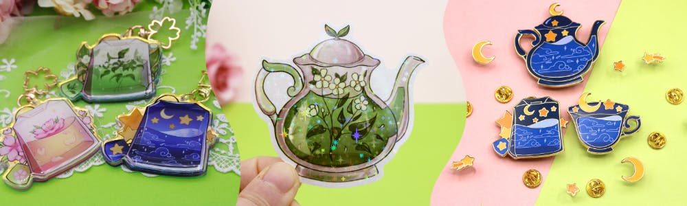 Choose a theme: starry, green tea or cherry blossom - 3x Magic Tea Party Enamel Pin (value 45€ -> 34€) - 3x Magic Tea Party Stickers (value 9€) Value: 54€ -> 43€ (20% off)