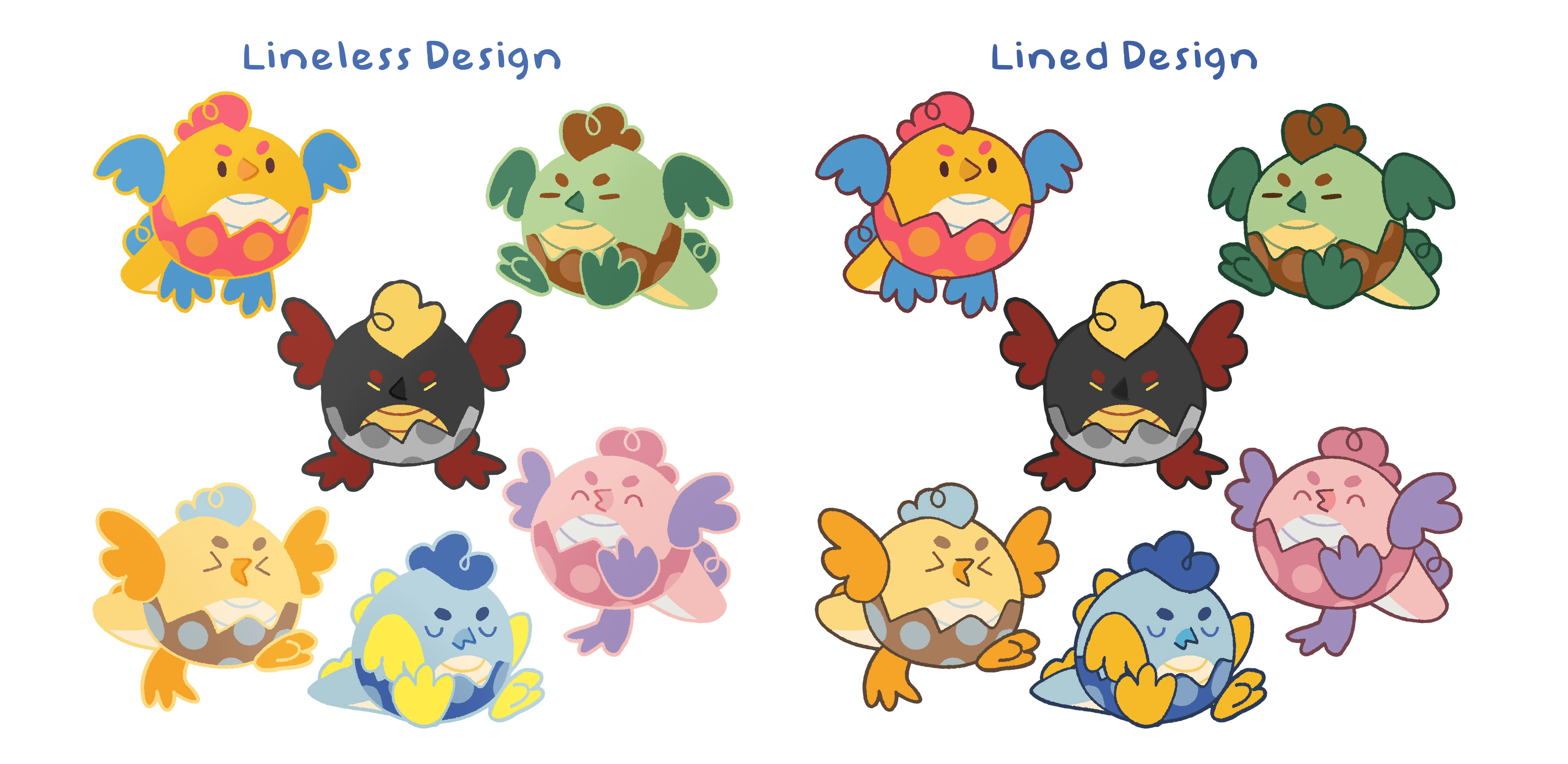 We want to ask you your preference for the companion sticker designs. We could make them with the dark lineart or make them lineless like the new dyed metal pins. Which would you prefer?