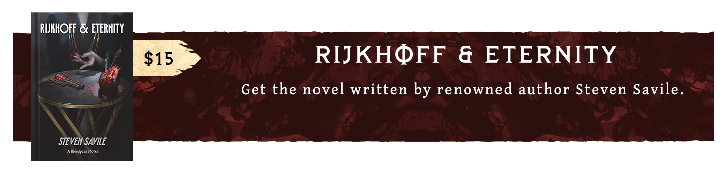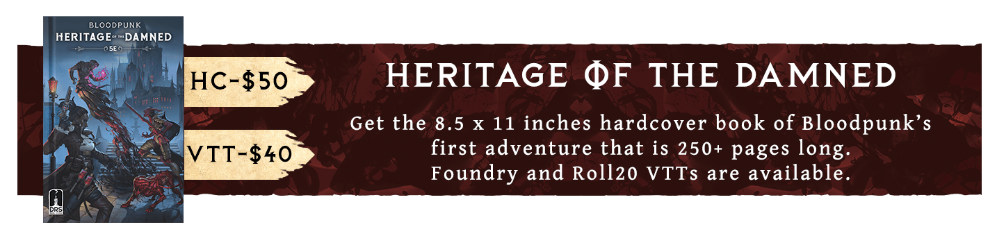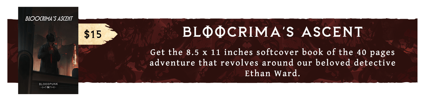 Bloocrima's Ascent: Bloocrima’s Ascent is designed for a party of three or four 3rd-level characters who are detectives of an investigator squad led by Ethan Ward. This adventure, set in Kanrath and Cyherested, is a short noir mystery of Bloodpunk 5E. Ethan Ward is a key NPC in the Heritage of the Damned; a depressed detective who crosses paths with the characters. Bloocrima’s Ascent takes place five years before the events of the Heritage of the Damned and it tells the story behind Ethan’s grumpy, melancholic nature.