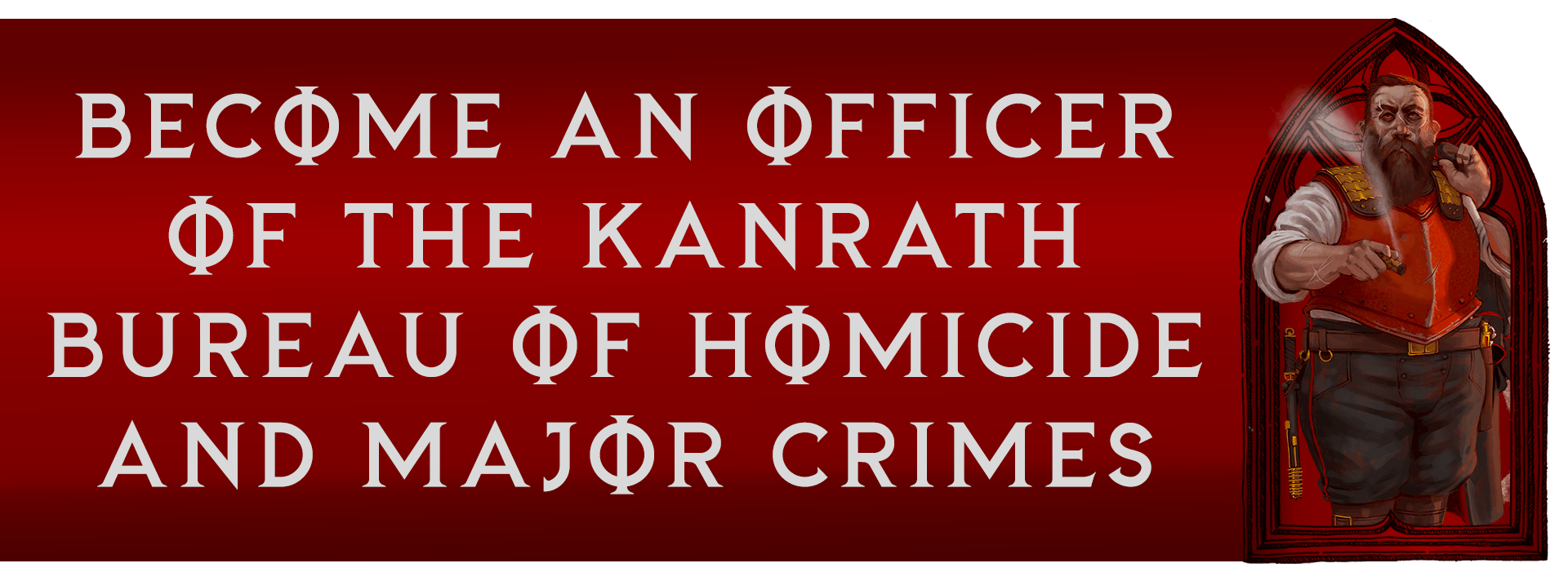 You are detectives of the Kanrath Bureau of Homicide and Major Crimes, sworn to uphold the law in a city that has long forgotten what order means. Each of the earlier mini adventures is directly tied to the events of the White Wake. At least one detective from the main White Wake party appears in each of these cases, while the rest of the group may consist of other detectives or members of the main party.