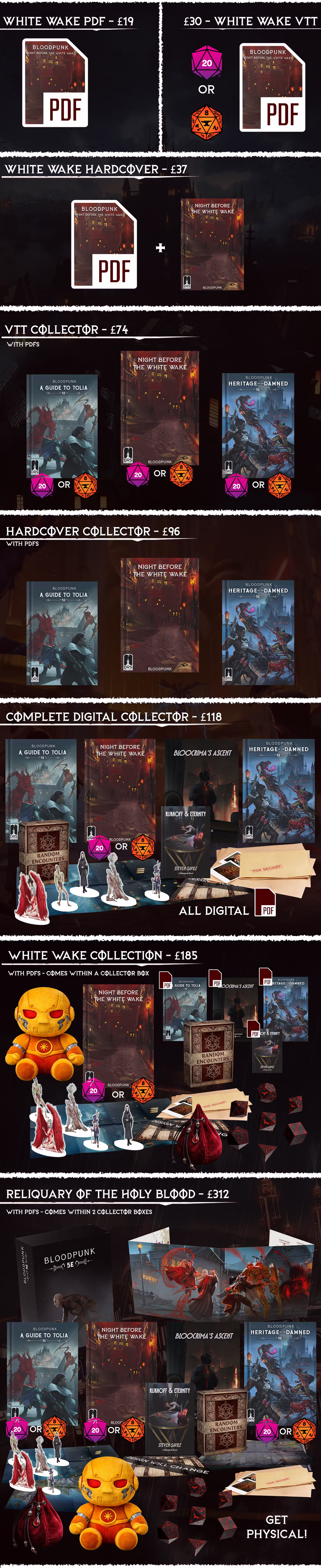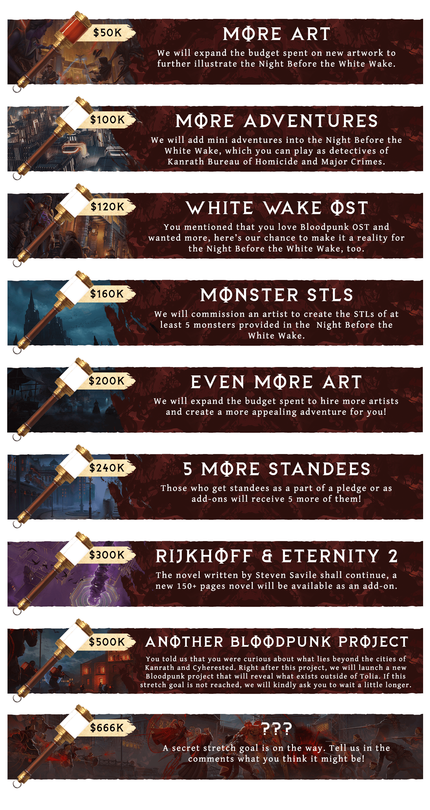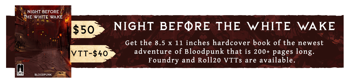 Night Before the White Wake: Night Before the White Wake is an adventure built around a terrible crime that shakes Kanrath to its core. While the enforcers scramble to uncover the truth, the gangs of Kanrath seize the moment, using the chaos to push their own agendas and drag the streets into deeper violence. The characters will face ruthless factions, brutal choices, unspeakable crime on the streets, and shifting loyalties as they fight to restore Kanrath to its old, twisted balance. With deadly paths and morally demanding decisions at every turn, the adventure branches based on the choices your table makes.