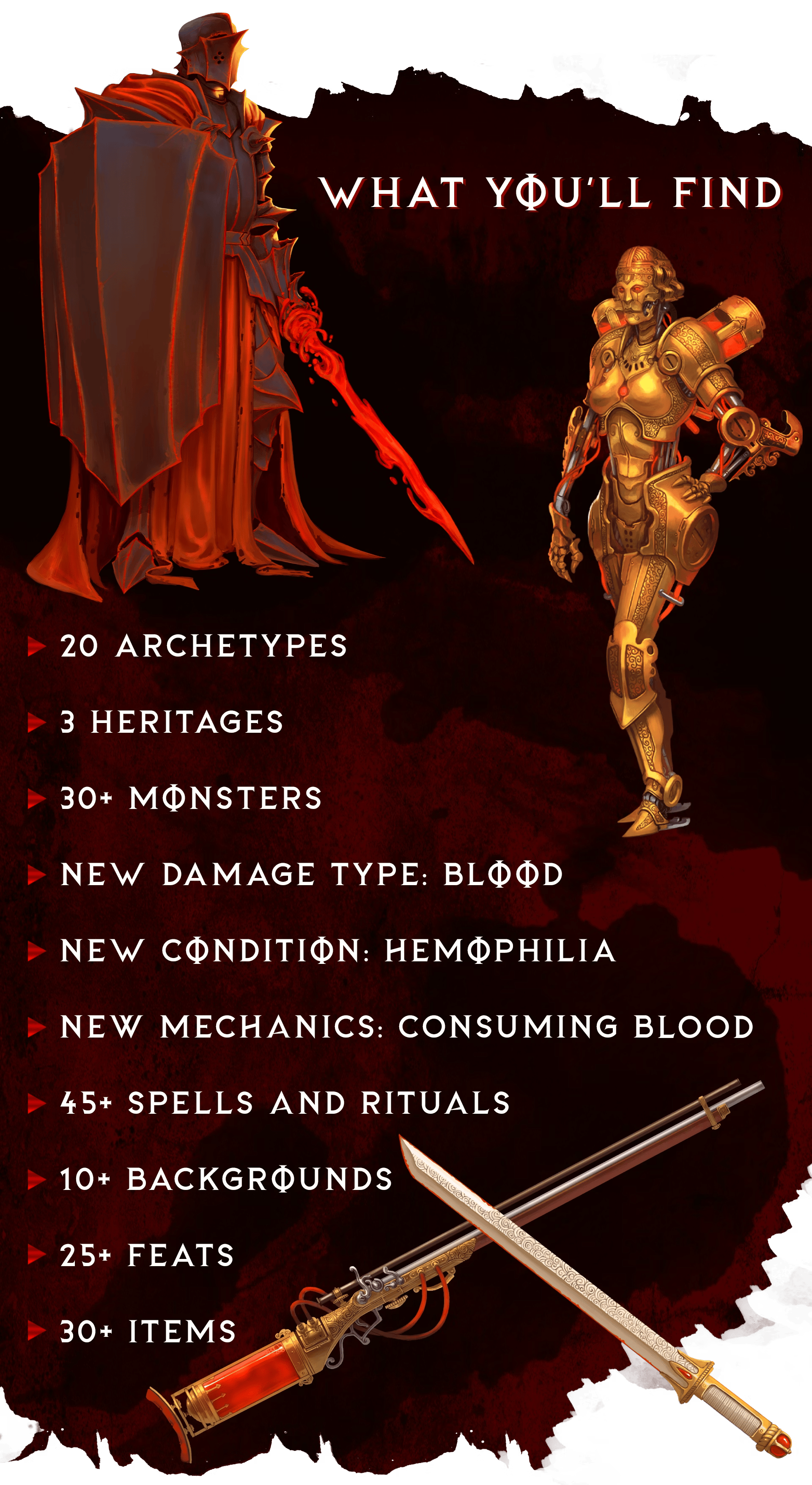 For those of you brave enough to adventure in the gruesome lands of Tolia, Bloodpunk offers plenty of options: 20 archetypes ranging from Veinscripter Wizards to Blood Knights and Bounty Hunters, 3 races, and 11backgrounds and 26 feats to further customize your character.