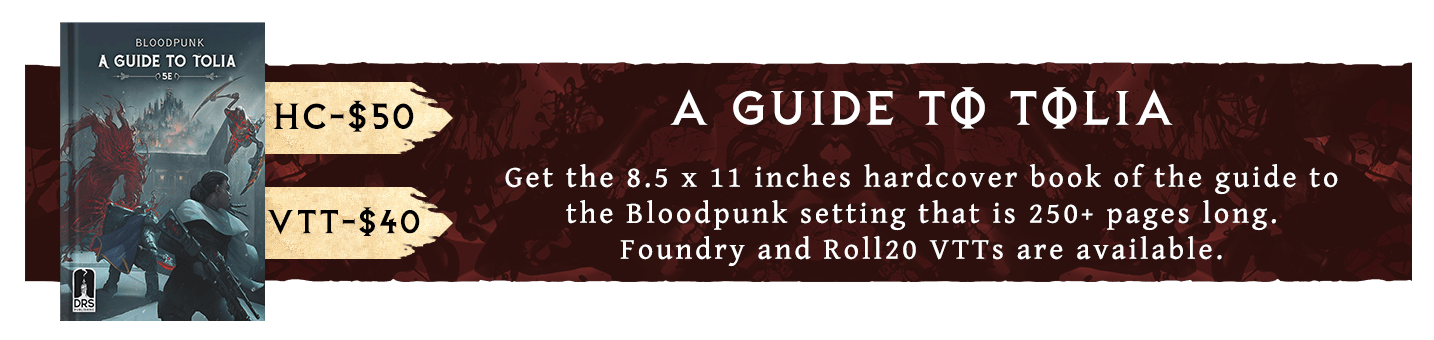 A Guide To Tolia: This book, made for both Game Masters and players, opens the doors to a world powered by blood itself. Inside, you’ll find Tolian races, archetypes, backgrounds, feats, monsters, NPCs, and countless story tools shaped by a long and bitter conflict between the Crimson City and the City of Deceit. Whether your table serves the oppressive regimes or joins the rebels fighting against them, Tolia is ready to challenge you, tempt you, and change you. A Guide To Tolia VTT: A Guide To Tolia is now fully available on Roll20 and Foundry VTT, revised, updated, and ready to play.