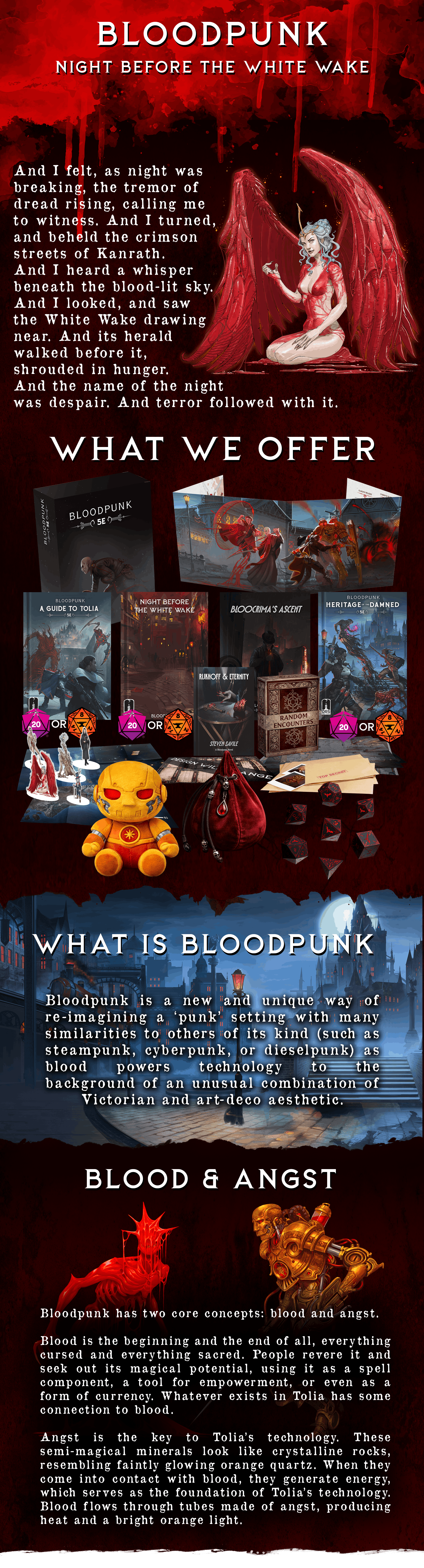 Murder Mystery Game: An interactive tabletop mystery designed to be solved by players through clues, crime scene reports, and deductive reasoning. Perfect for one-shots or integrated story arcs, this game challenges the players to unravel motives and secrets in a tightly woven narrative. Plushie: The living blood engine in its softest form. The plushies are inspired by the iconic metal-folks of Bloodpunk, Bloodwork Automatons. This cuddle-friendly collectible brings a touch of whimsy to your tabletop world while celebrating the unique aesthetic of Tolia. Bloodpunk Dice Set: A custom set of dice forged to match the theme of Bloodpunk. This dice set adds a touch of flavor and excitement to every roll, making it perfect for character creation and immersive storytelling. The design may change. Blood Drop Pouch: A custom Bloodpunk dice set is completed with its own crimson velvet pouch. Deep red fabric and a blood-drop charm give it a dark, gothic feel straight out of Kanrath, both practical and perfectly on theme.