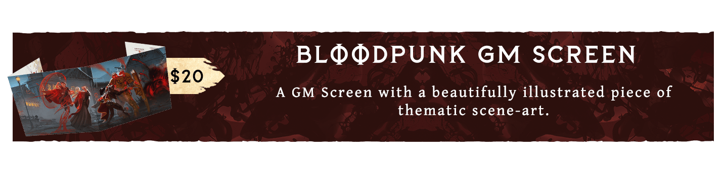 Bloodpunk GM Screen: A beautiful GM screen featuring atmospheric Bloodpunk art, essential tables, and reference content. Includes mechanics like Blood Degeneration and Bloodwork Weapons to streamline play in the Tolia setting, keeping your campaign running smoothly while immersing your group in gothic dread. Illustrated by Ender Coşkun.