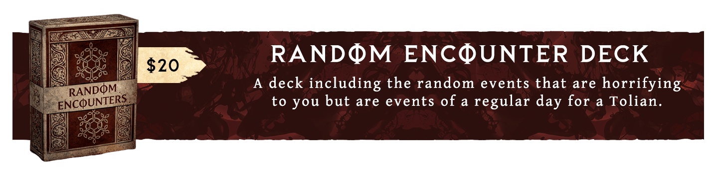 Random Encounter Card Deck: A shuffleable deck of tarot-sized cards that describes 30 different encounters. From eerie street scenes to sudden combat, this deck helps GMs enrich exploration with dynamic events, flavor, and narrative twists.