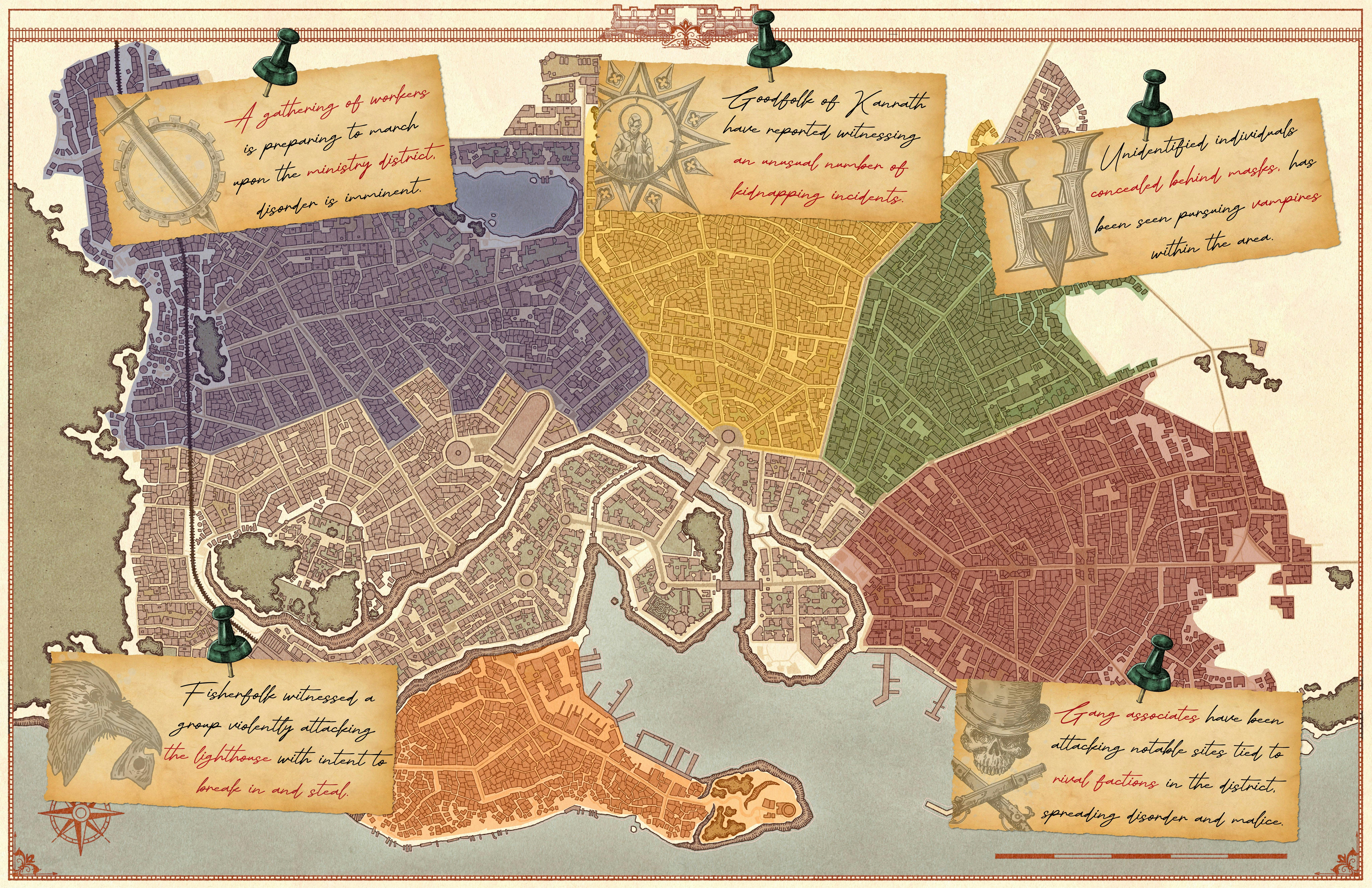 So... The book contains at least five distinct storylines and five playable adventures, all feeding into the Night Before the White Wake. This number can expand further through stretch goals, adding new cases, factions, and paths through Kanrath’s darkest night.