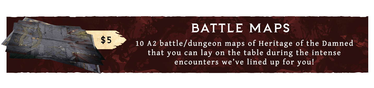 Heritage of the Damned Dungeon Maps: Ten large A2 battle and dungeon maps designed for tense encounters. Use these grids to elevate combat, exploration, and investigation scenes across the blood-soaked cities of Tolia, enhancing tactical play and immersion for every table.