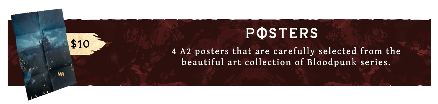 Posters: Four A2-sized, high-quality posters depicting iconic art, or thematic scenes from Bloodpunk. Ideal for decorating gaming spaces or inspiring sessions.