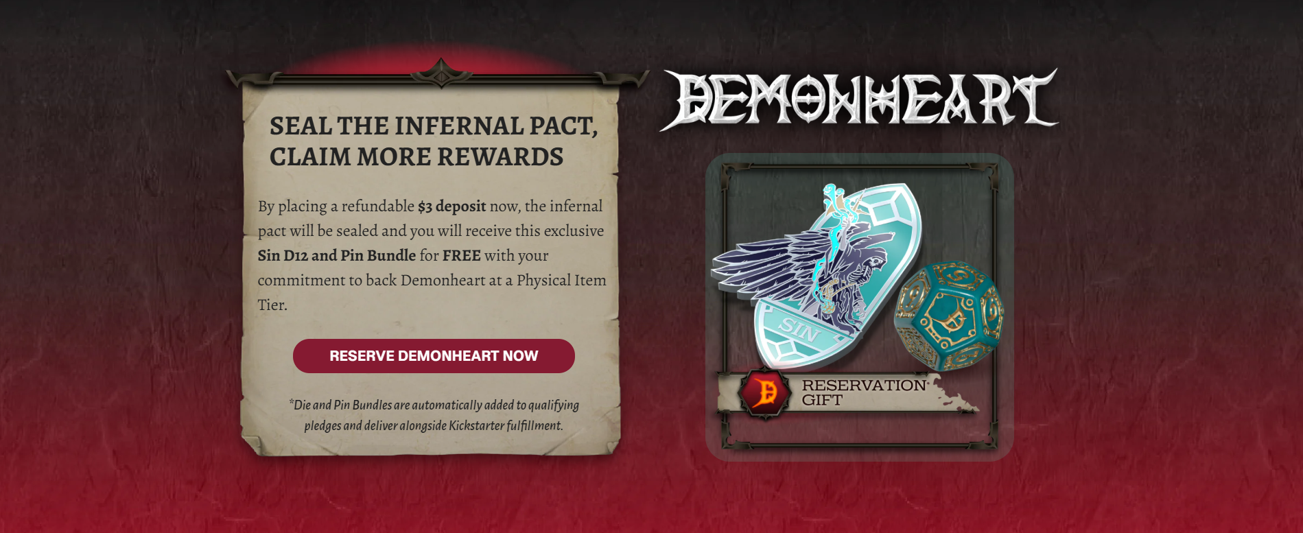 If your pledge includes physical rewards when we launch Demonheart, this Sin D12 die and its matching pin will automatically be added to your shipment.