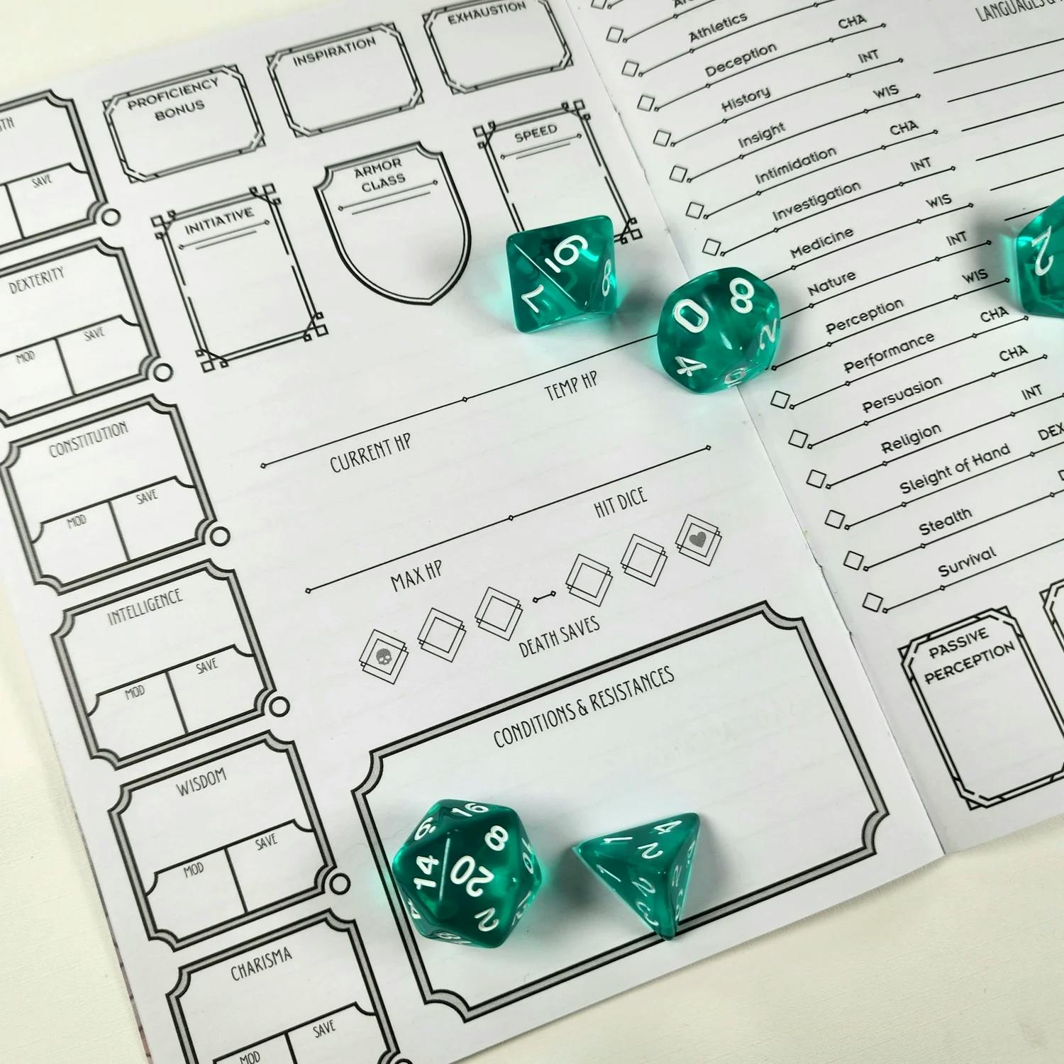 Upgrade your D&D character sheet to a character journal! 5” x 7” paper journal with 48 pages of nerdy goodness. Pages designed for your stats, skills, feats, spells, background, companion/familiar, equipment, inventory, and plenty of blank pages for your campaign notes. This little gem even includes an obituary page, you know, for when your adventurer "retires".
