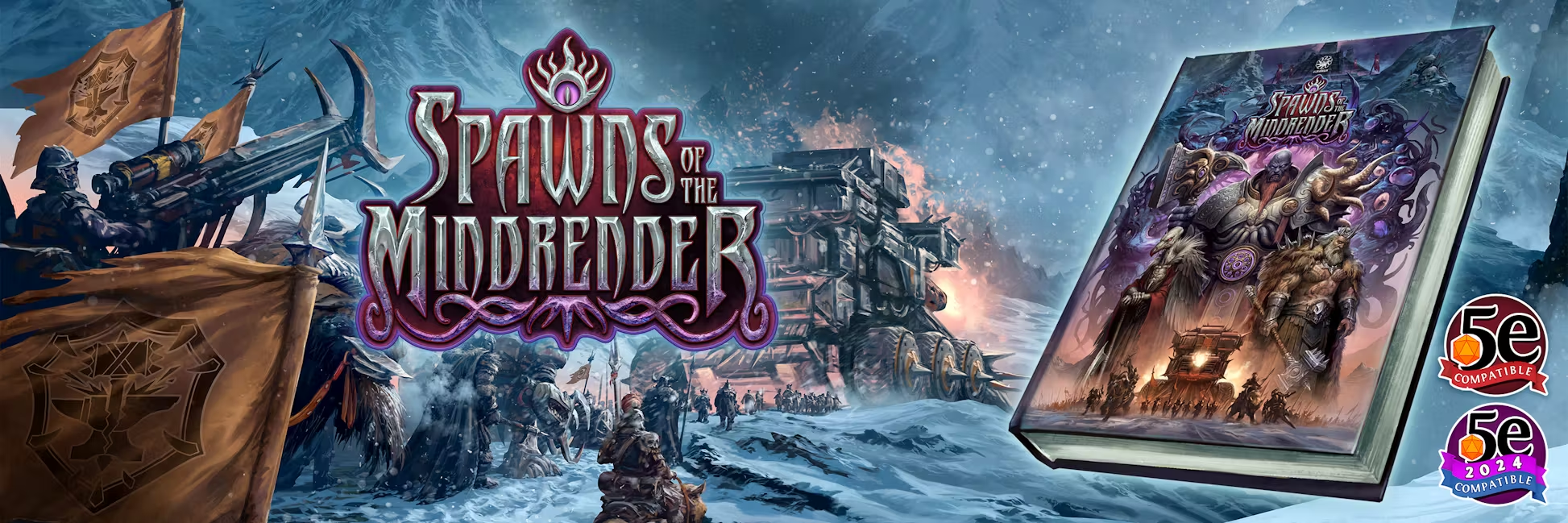 Spawns of the Mindrender is a massive 600-page dark fantasy adventure and campaign setting for levels 11–15, built for both 2014 and 2024 5e. It leans hard into survival, exploration, and large-scale conflict in a brutal mountain realm, with a branching narrative that evolves as players dig deeper.