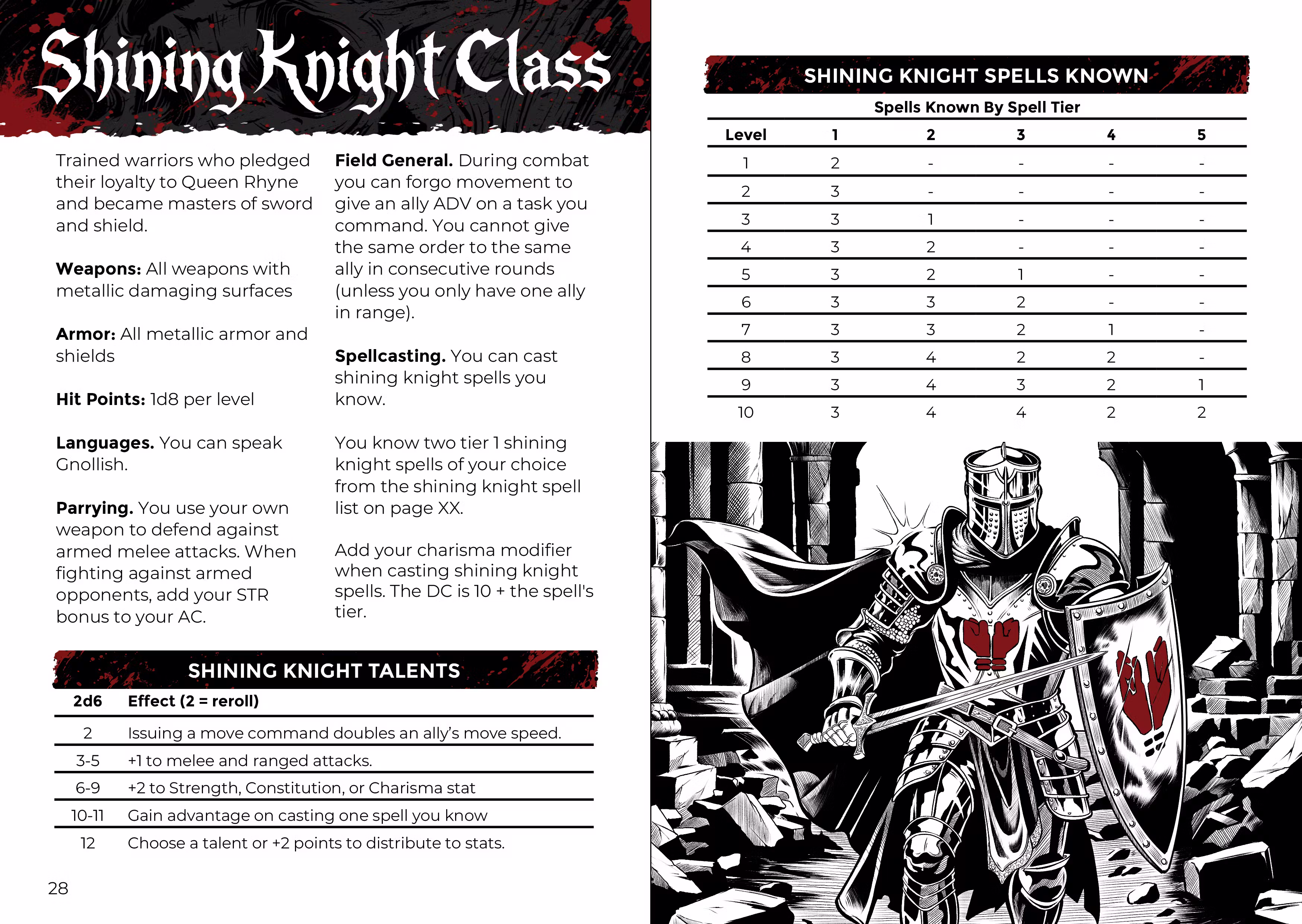 None earn the title of Shining Knight lightly; only those who endure years of relentless training and rise through the highest ranks are permitted to bear the name. They are also trained in a specialized arcane discipline built for combat tactics, allowing them to reshape the battlefield while fortifying and rallying their allies.