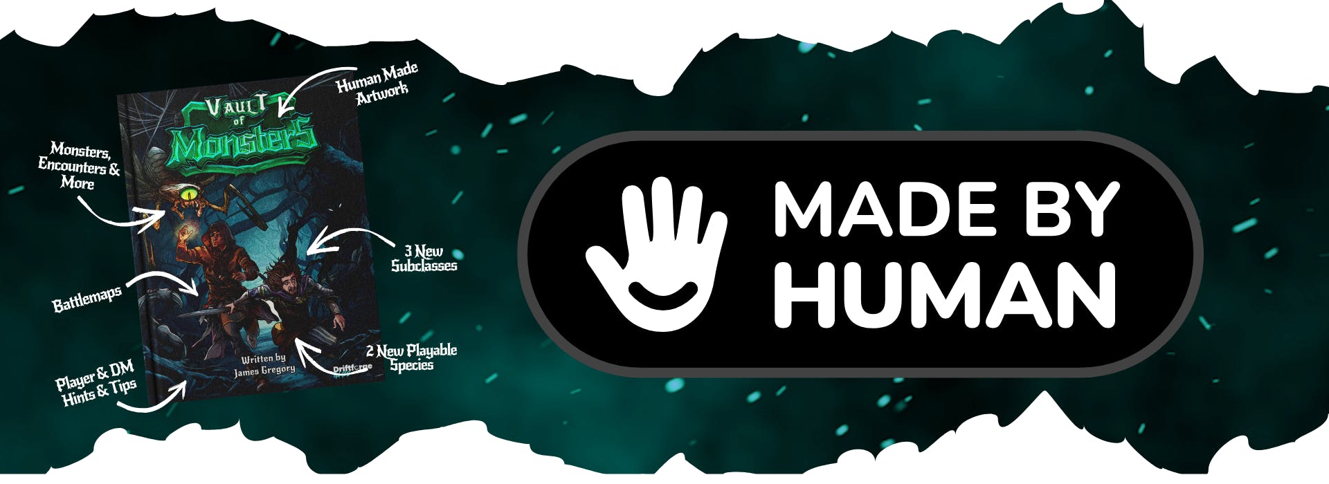 Vault of Monsters contains no AI-generated artwork. All artwork in the project is 100% human-made by Nick Ashton of Chicken Monster. We have not used AI art in this campaign and do not plan to use it in the book or related materials. We believe in supporting real artists and properly commissioning human creative work.