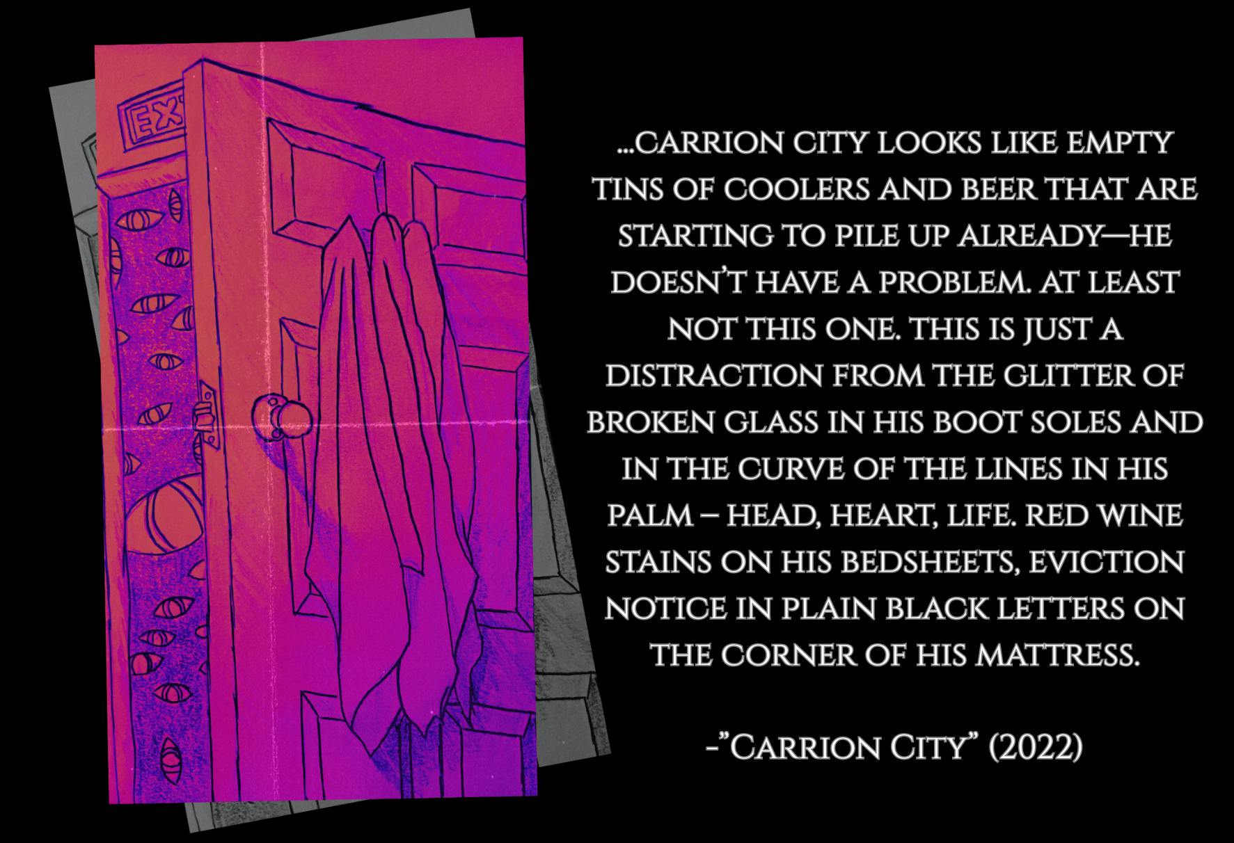 In 2022, a lot of things happened in my neck of the woods. First of all was, of course, the "Freedom Convoy", a bunch of people in trucks that set up in my neck of the woods (quite literally on my doorstep, actually). I lost my job as a result -- and my mental health, always something I've struggled with, started spiralling. Over the next year, my girlfriend and I went through separate periods of housing instability -- for the first time in my life, I was genuinely homeless, couch-surfing, and trying to secure housing with no success. I managed it through the kindness of a near-stranger (who has now become family) but the experience, as anybody else who's been homeless or housing-insecure knows, changes you. Out of that experience was born the first Carrion City; an art-zine about famine, hunger, poverty, and cannibalism.