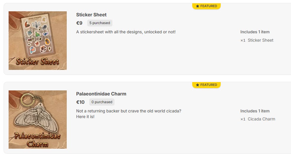 I've also had questions about acquiring all the designs without getting them as pins, as well as an option to get the old-world cicada wooden charm if you're not a previous backer. To which I say, I got you ;)